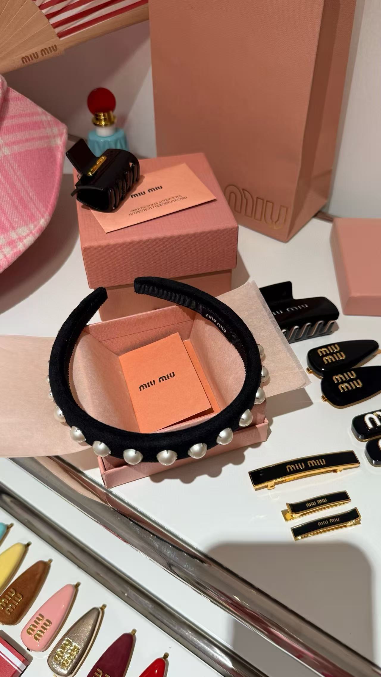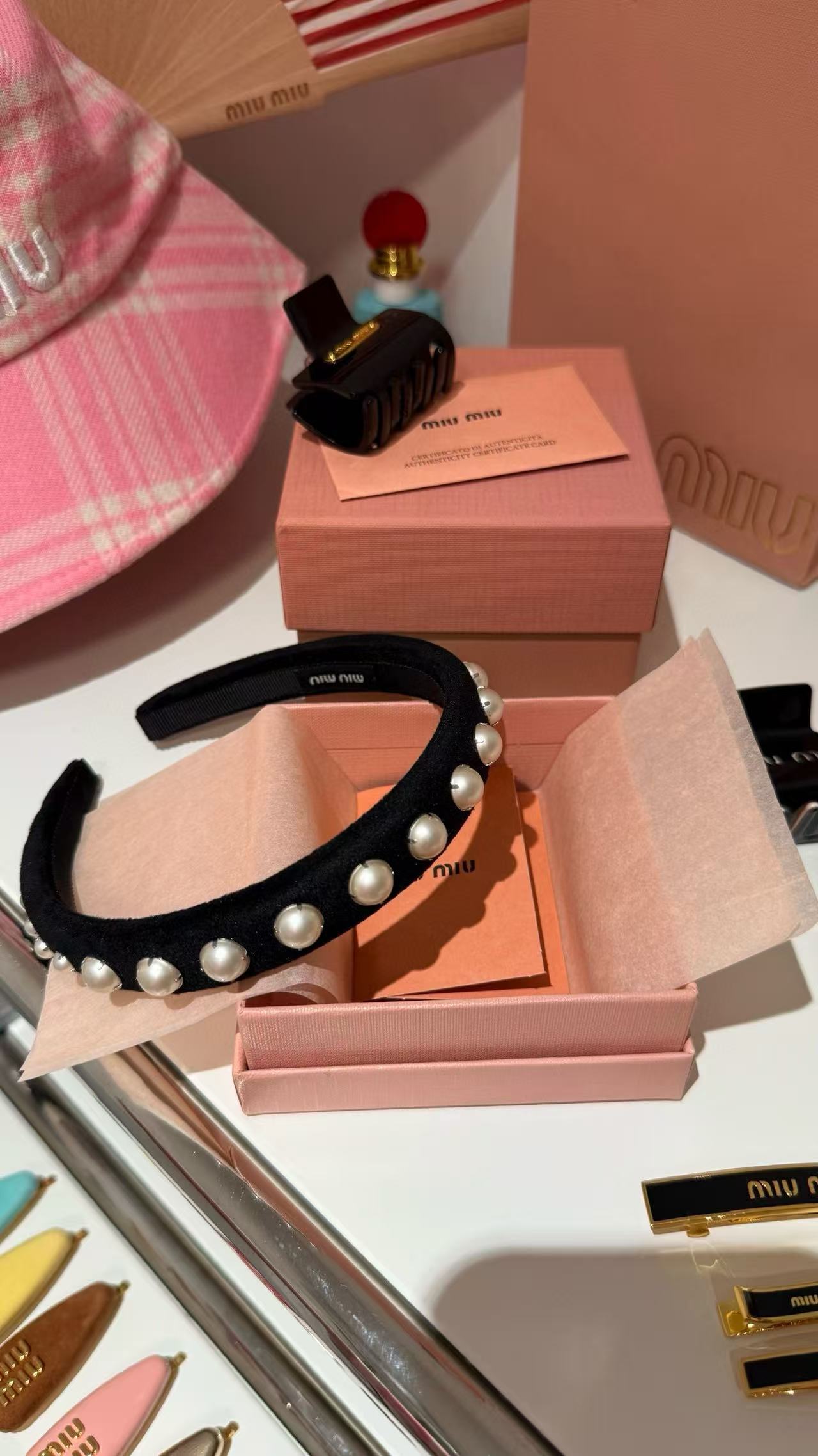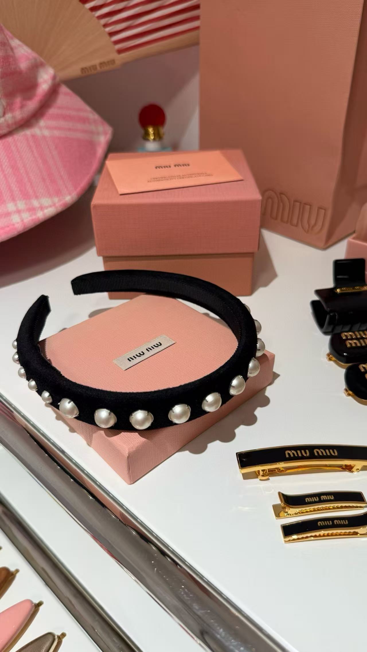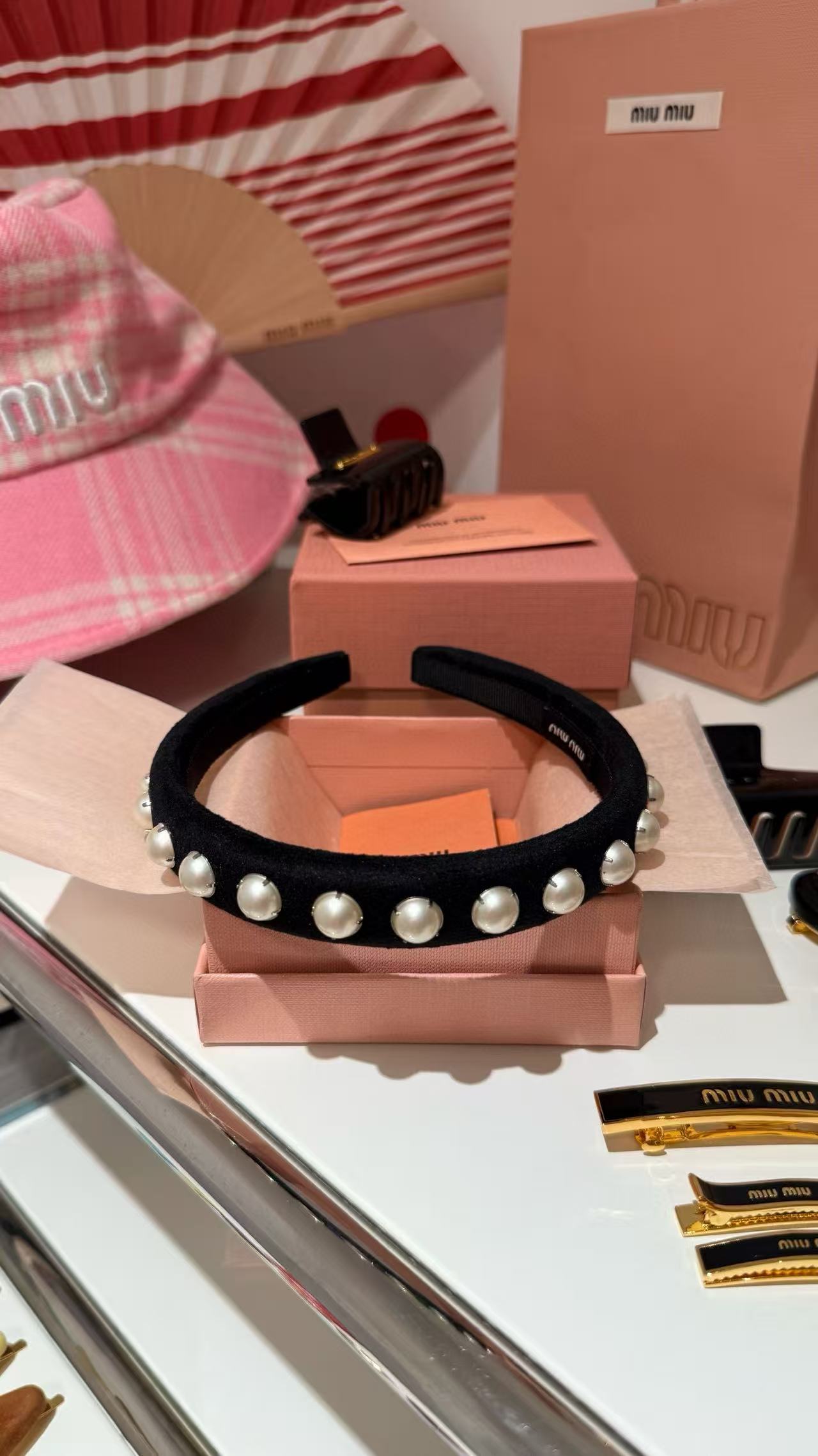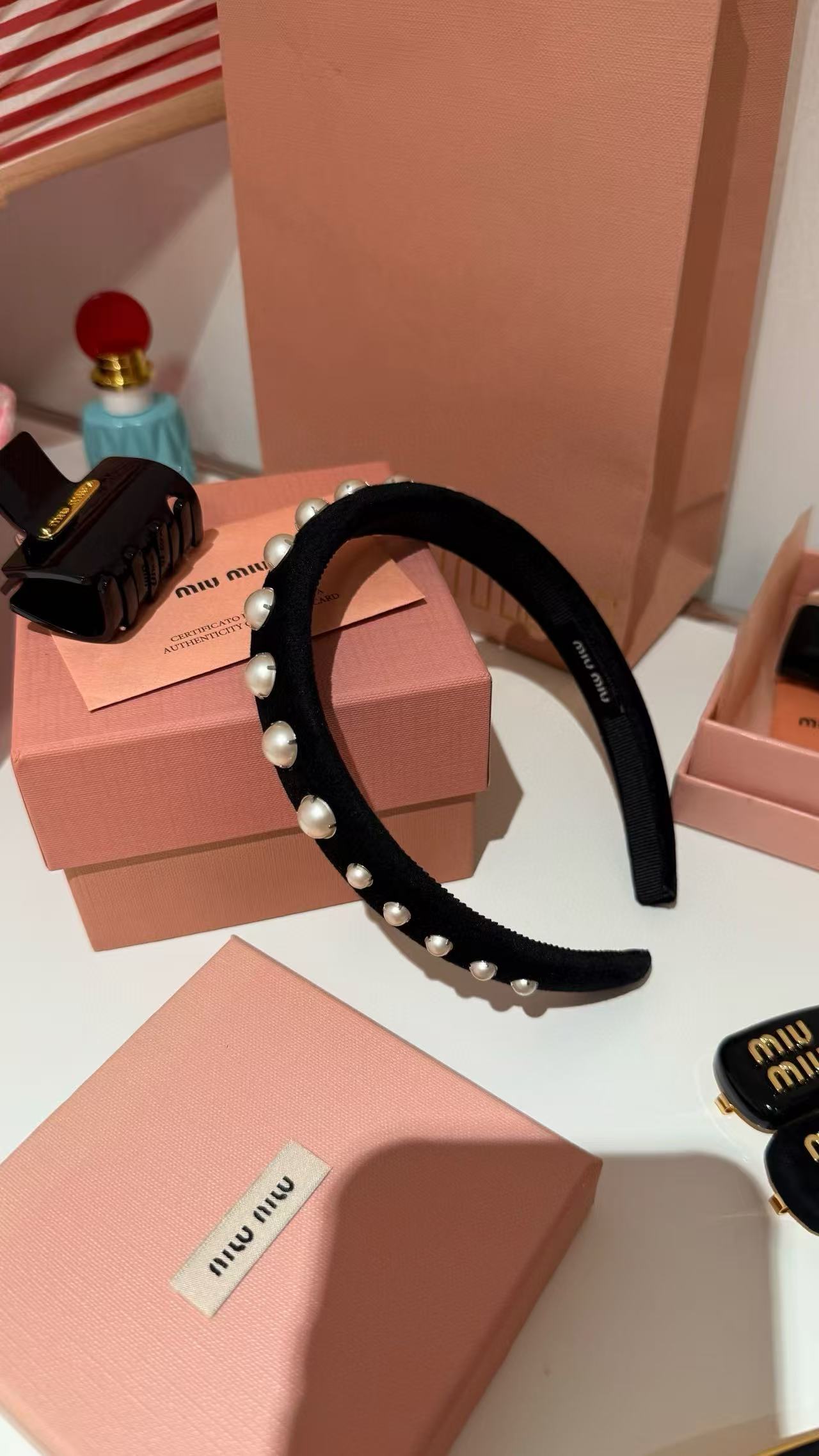 2025早秋 MIU MIU 黑色天鵝絨大顆珍珠髮箍 精品 A貨:貴氣優雅,千金必備