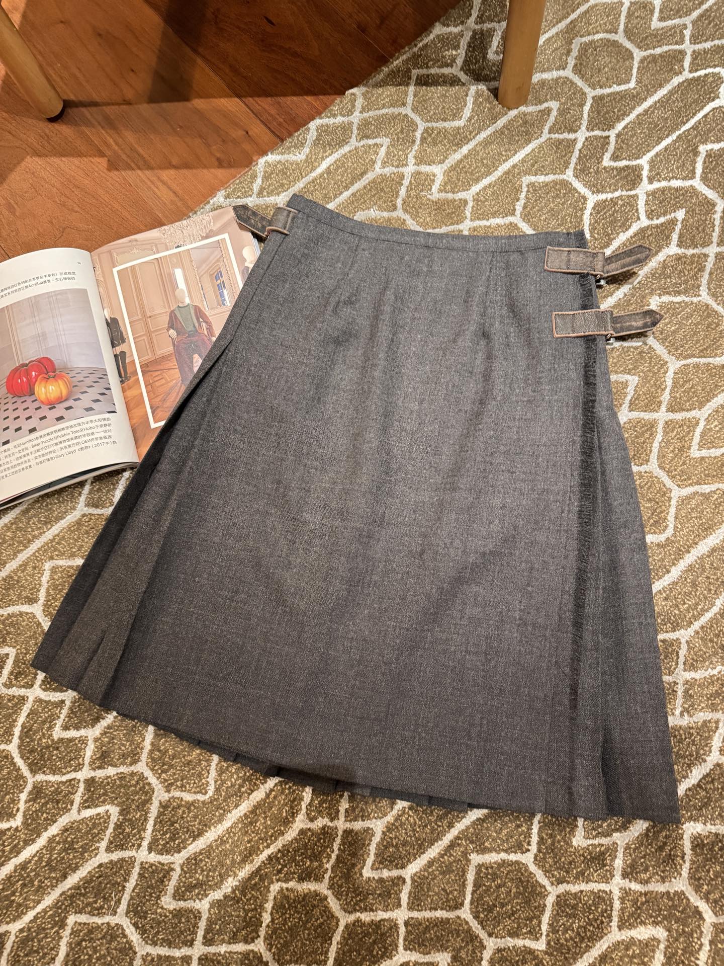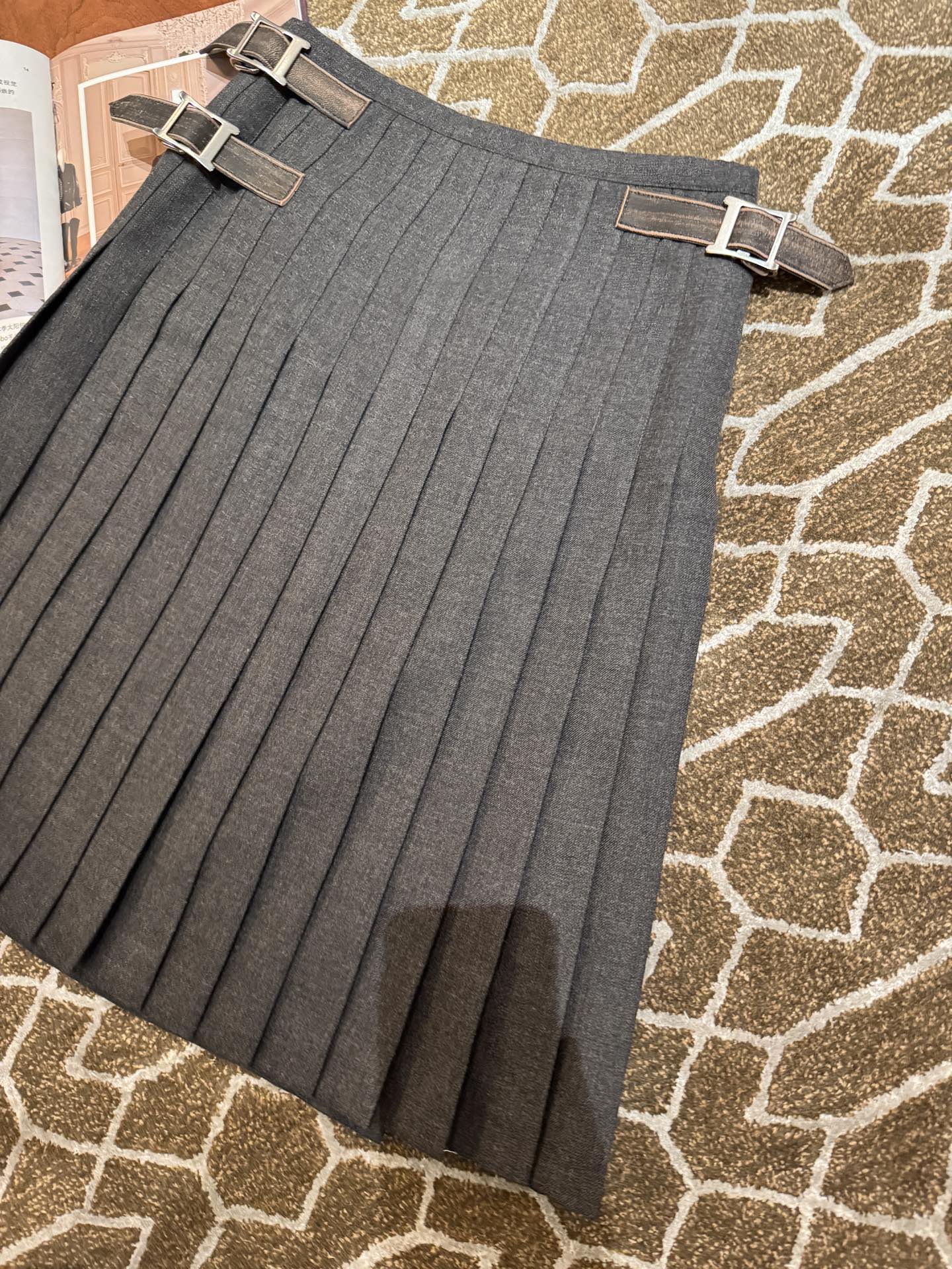 皮扣部分使用小羊皮經過做舊洗水處理,柔軟卻有韌性,細節質感非常出眾。這樣的材質與工藝組合,讓整件裙子不僅穿起來舒適有型,更是秋冬質感的代表作。