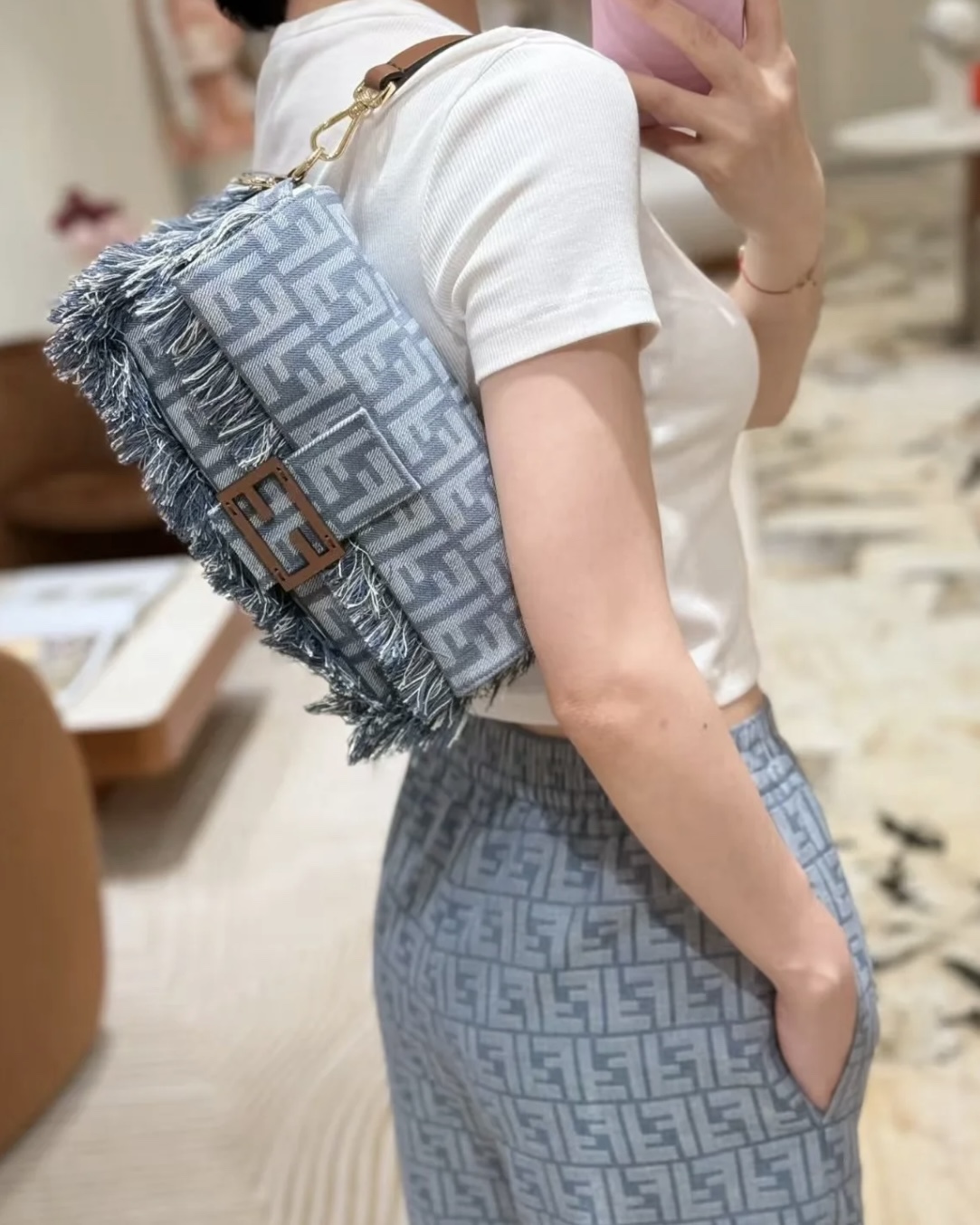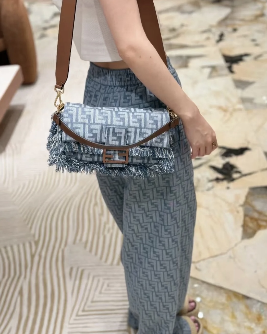 以經典法棍包型為基礎,結合牛仔提花與標誌性的 FF 元素,展現獨特又耐看的設計感。