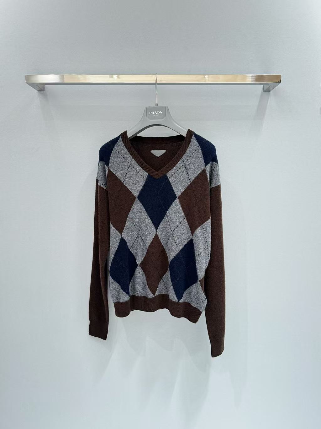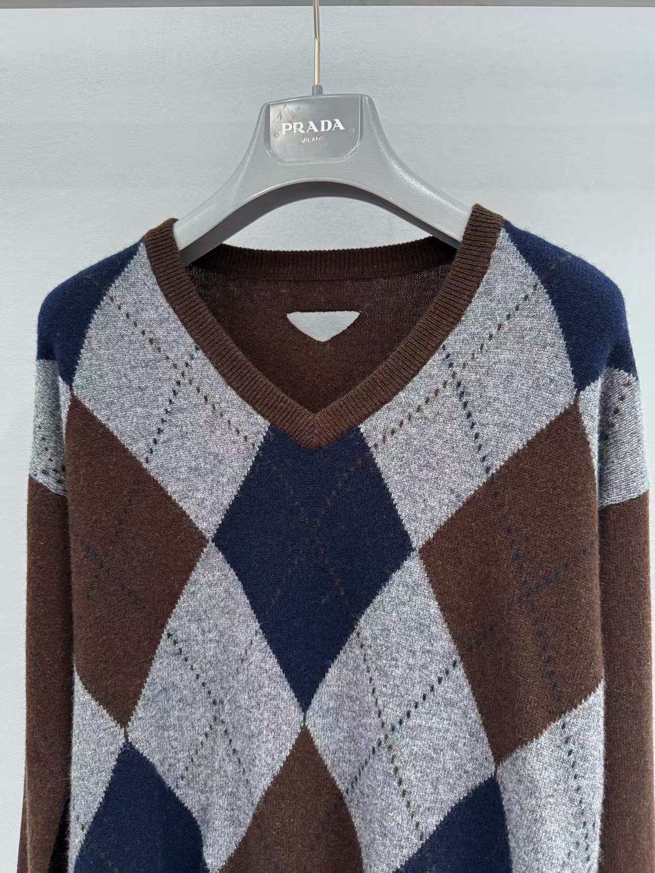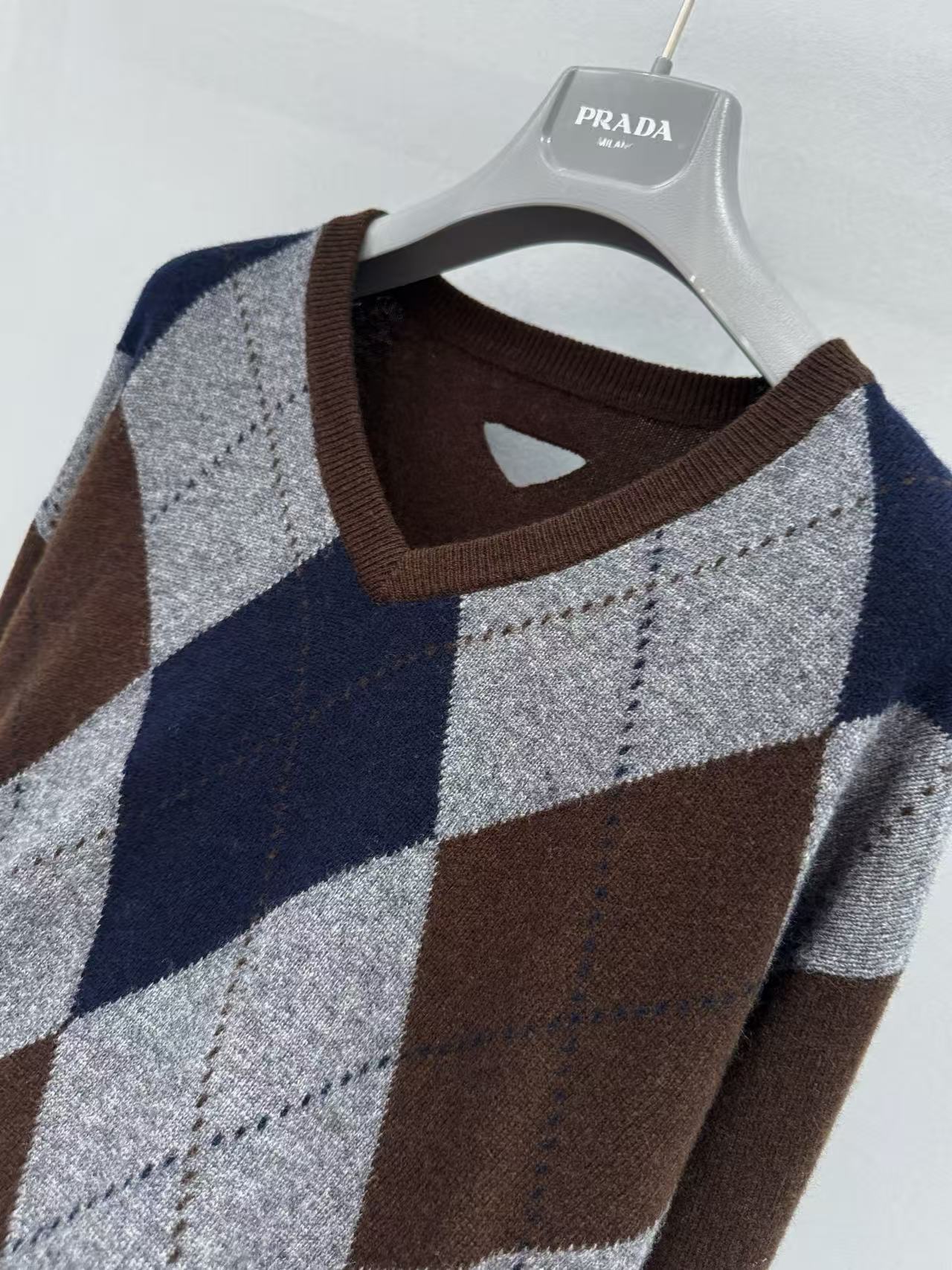 2025早秋 Prada 撞色菱格羊絨針織衫 精品 時尚