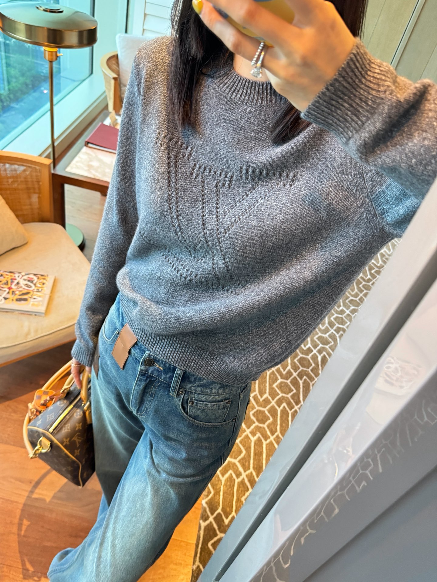 灰色的色調乾淨俐落,低調卻不單調,穿起來整體氛圍非常溫柔又有格調。那種極簡中帶出質感的氣質,是很多奢侈品品牌最擅長的,也是這件毛衣最迷人的地方。