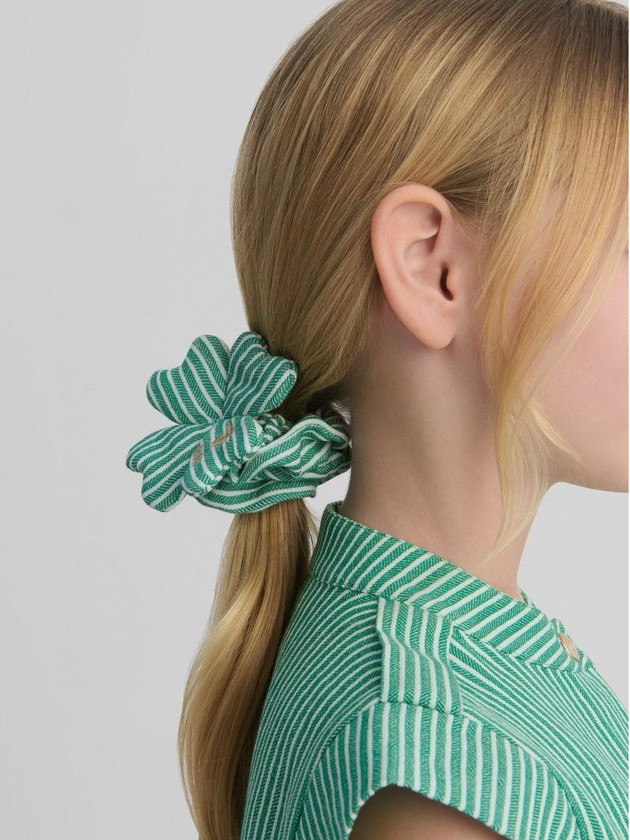 第一款以棉質與亞麻混紡製成,象牙白與綠色條紋交織出柔和的清新氣息,手工縫製的四葉草造型更添幸運寓意;