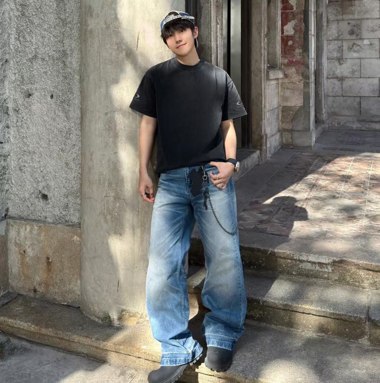 褪色水洗效果:T 恤經過了特殊的褪色灰色水洗效果處理,這是通過後整理工藝模擬自然舊化感的獨特技術。通過控制性的石磨、酶洗等工藝,在深色基底上形成不均勻的褪色痕跡,從而營造出柔和、復古的灰度視覺效果,充滿了故事感。