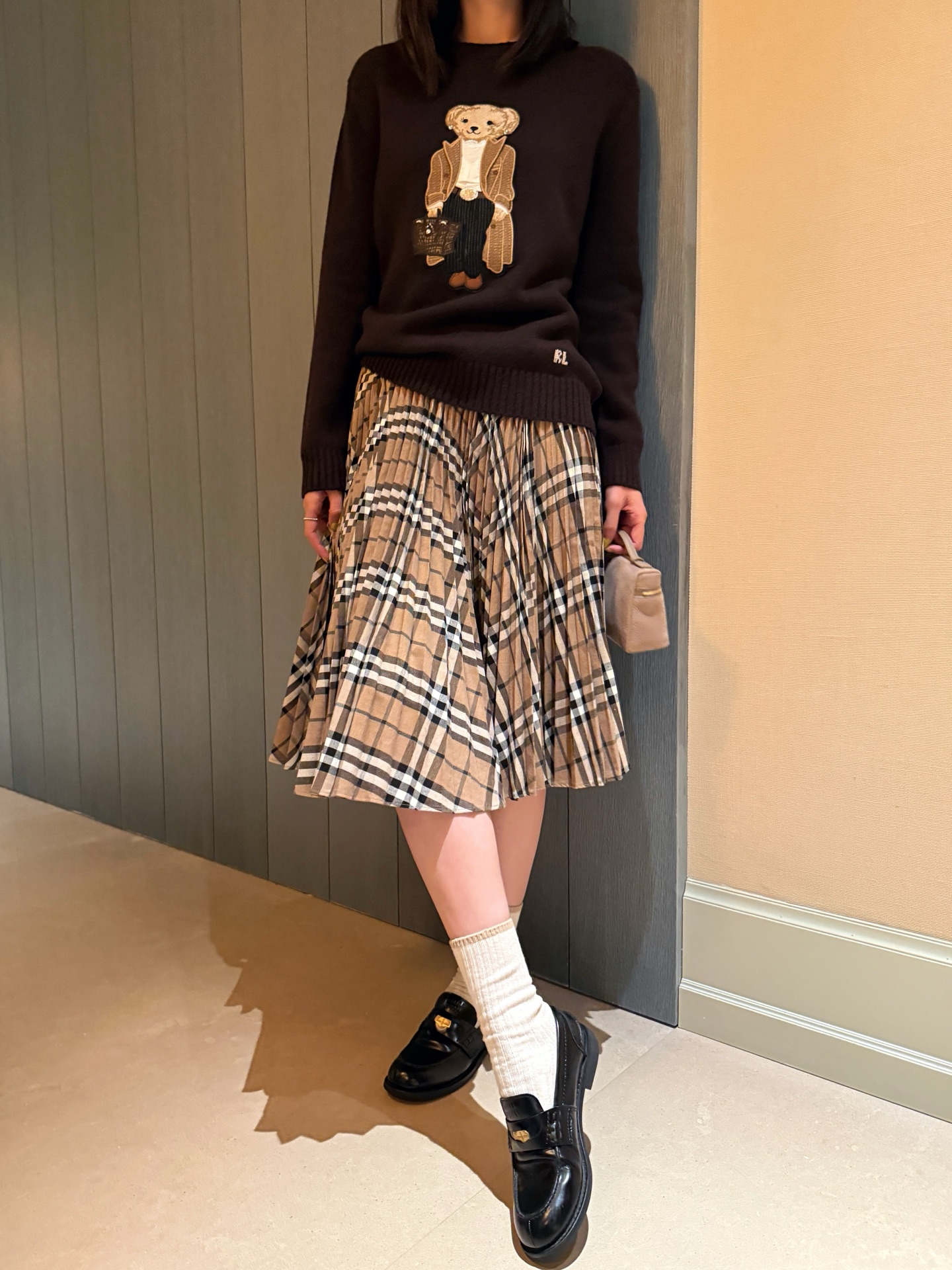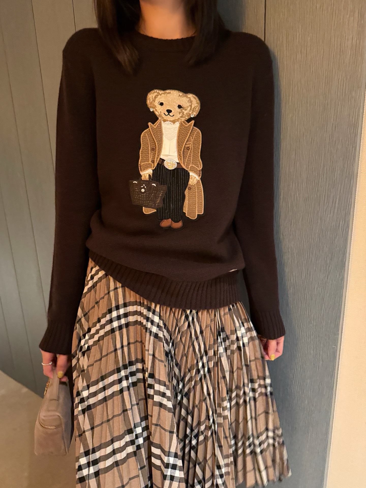 紫標系列的最新登場!這款小熊針織衫搭配風衣造型,整體散發出一種既高級又鬆弛的氛圍。