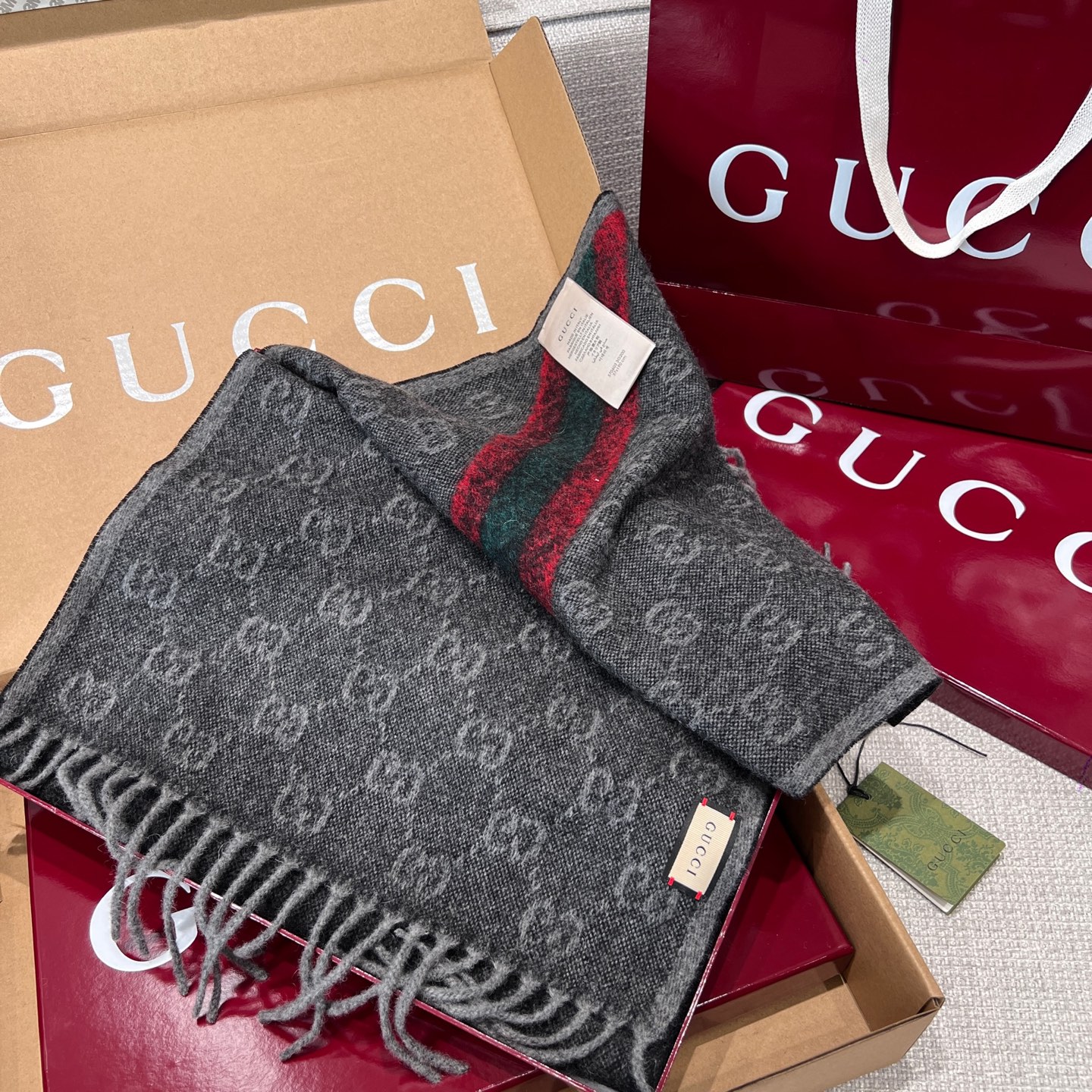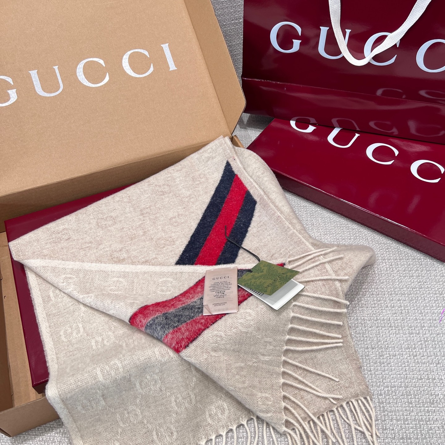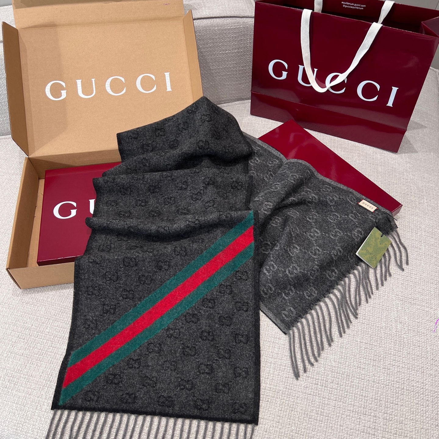 最吸睛的細節在於圍巾一側的紅綠織帶裝飾,低調中藏著滿滿品牌靈魂,搭配任何外套都能瞬間提升造型層次。不論是日常通勤還是出國旅行,都能輕鬆駕馭。