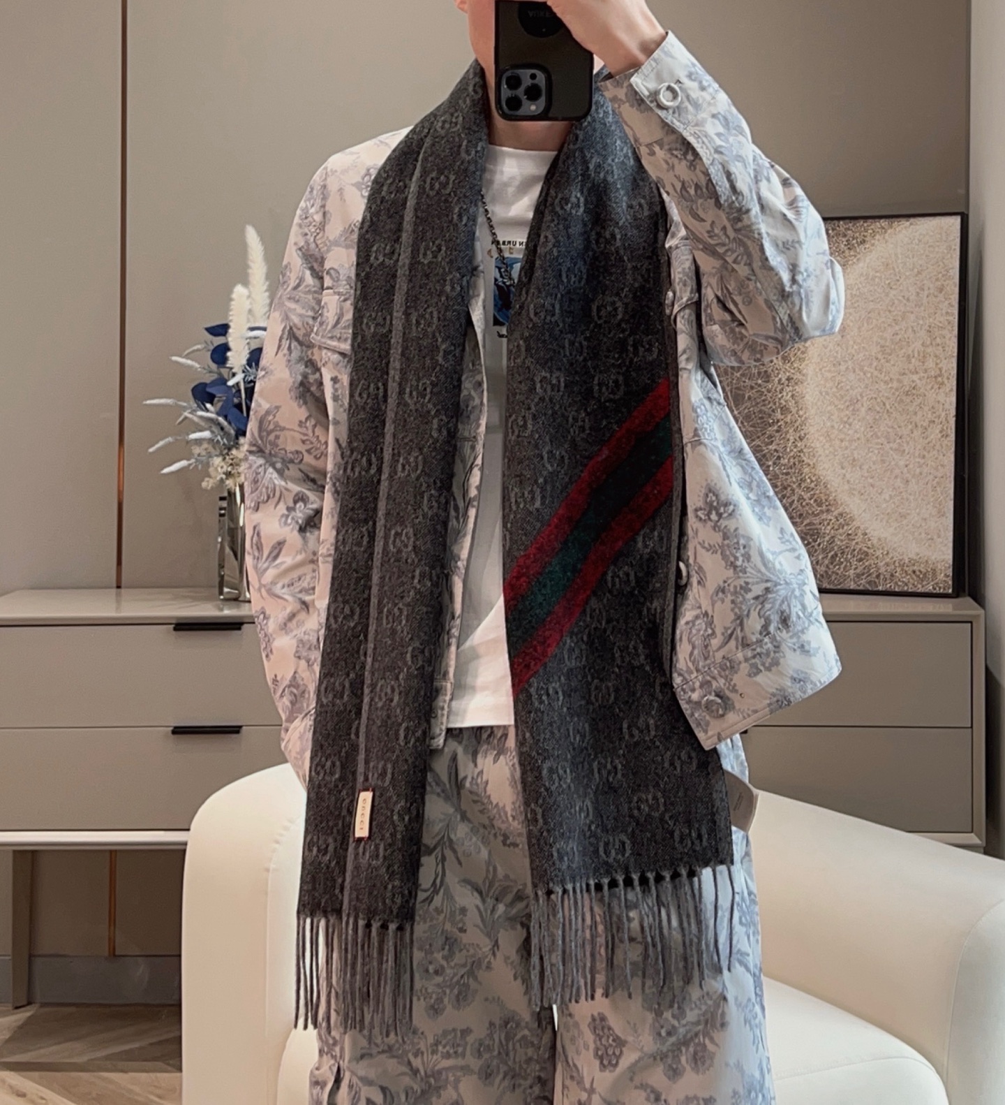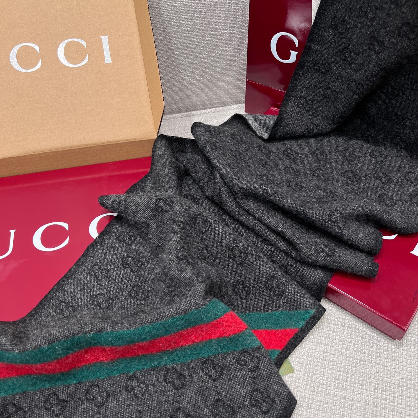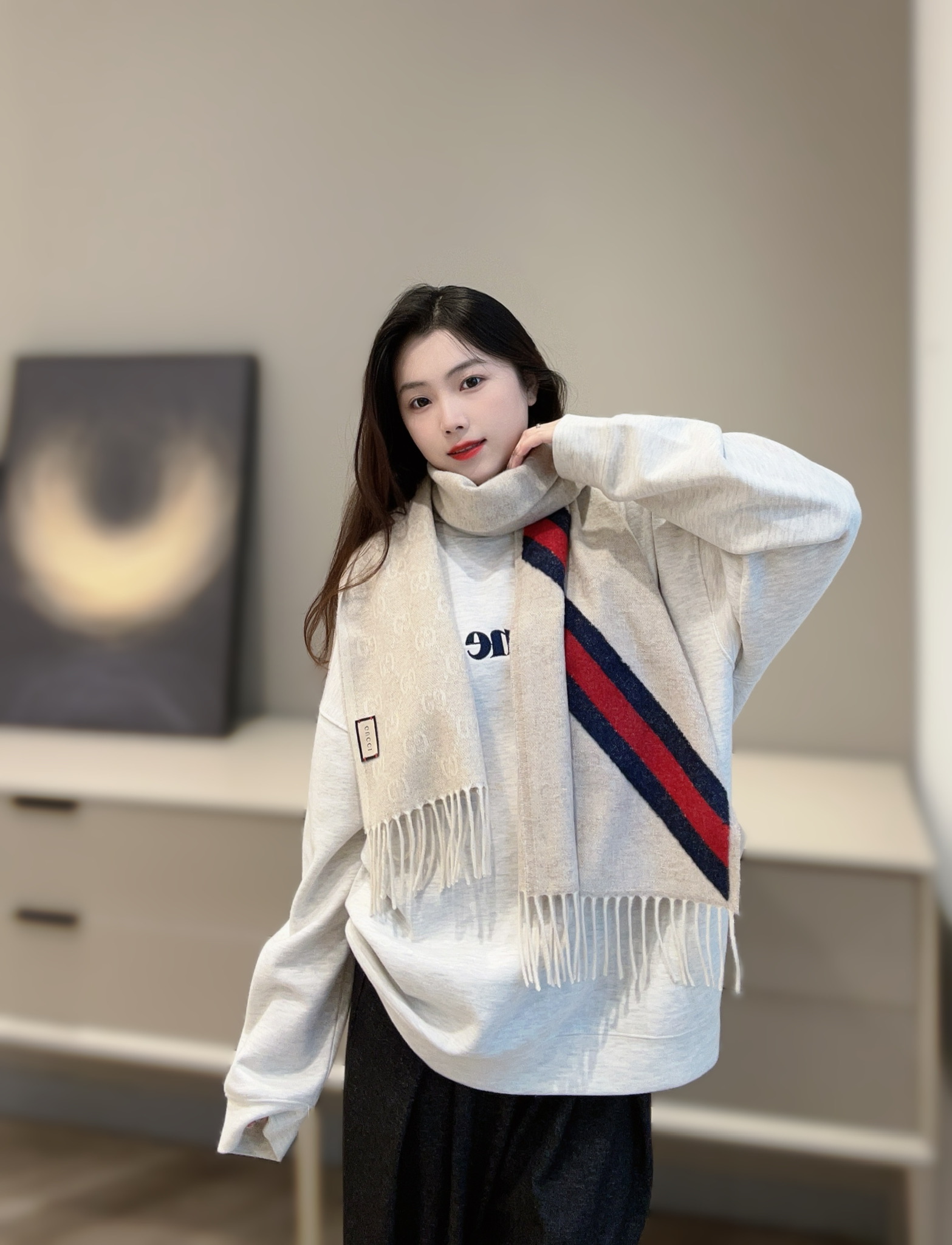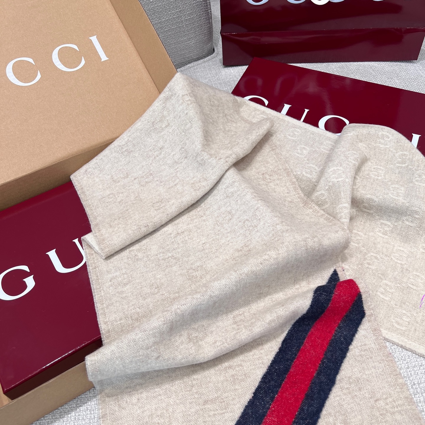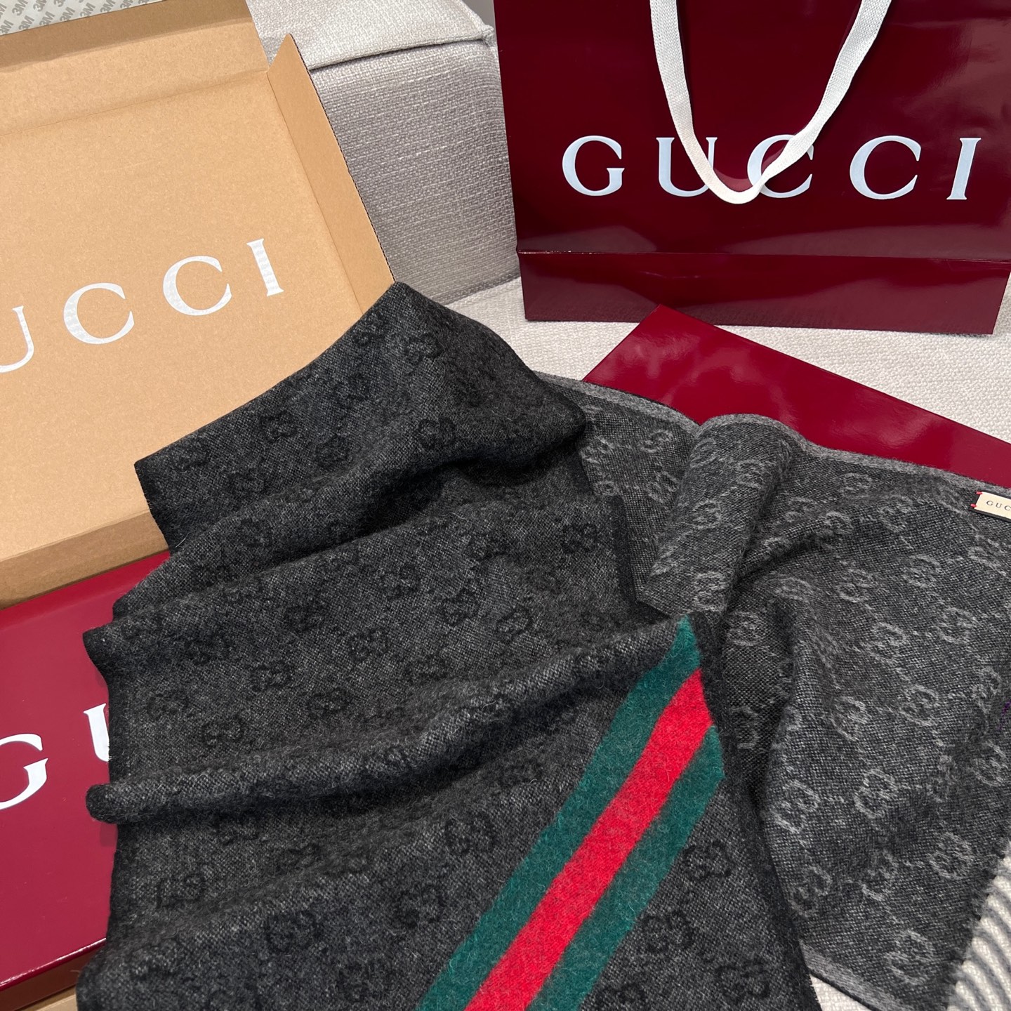 這條圍巾真的超級經典又百搭!採用標誌性的雙G提花設計,整體低調卻不失辨識度,那種一眼就能看出的高級質感,讓人完全無法忽視。