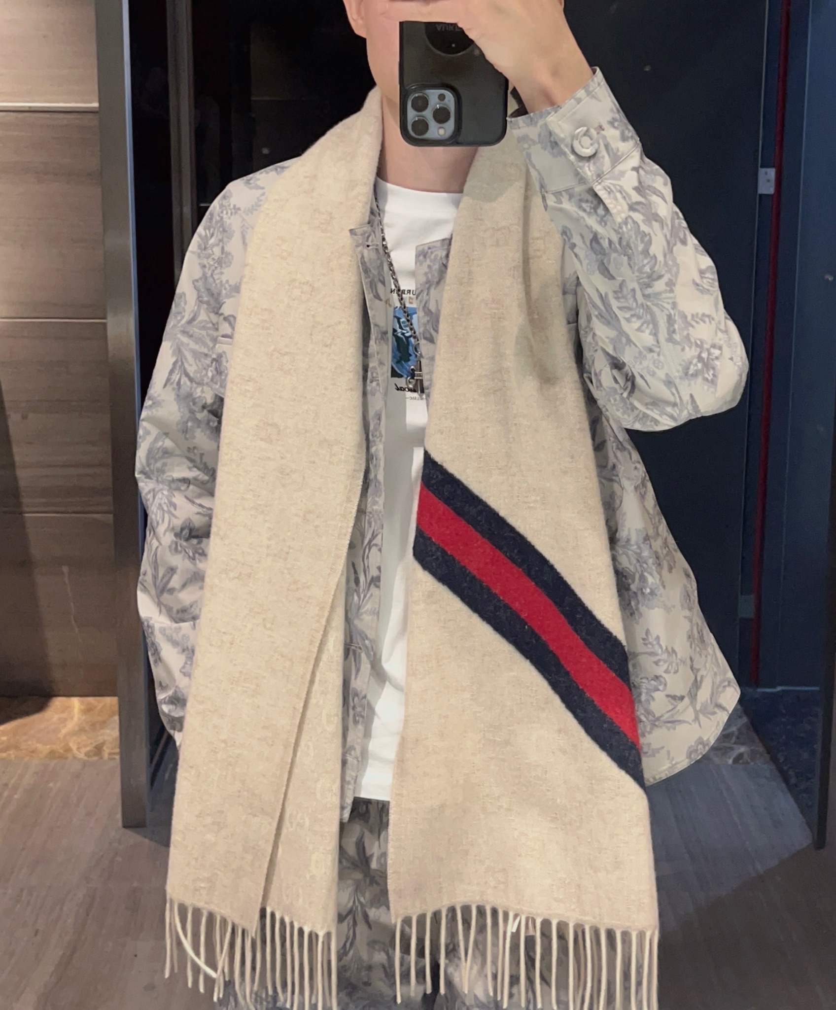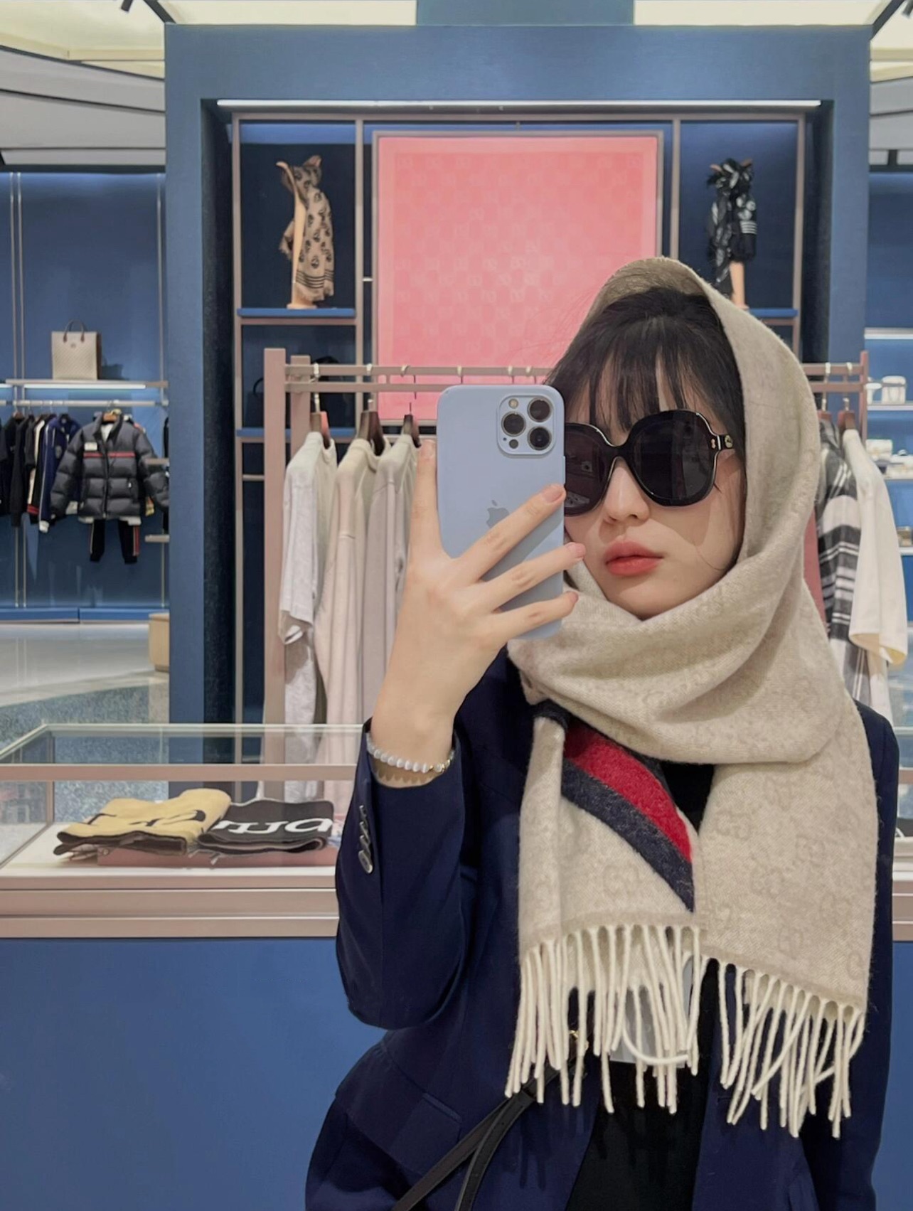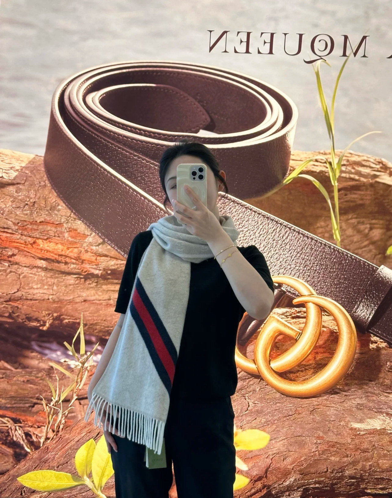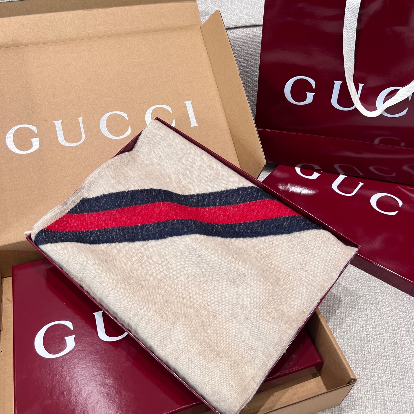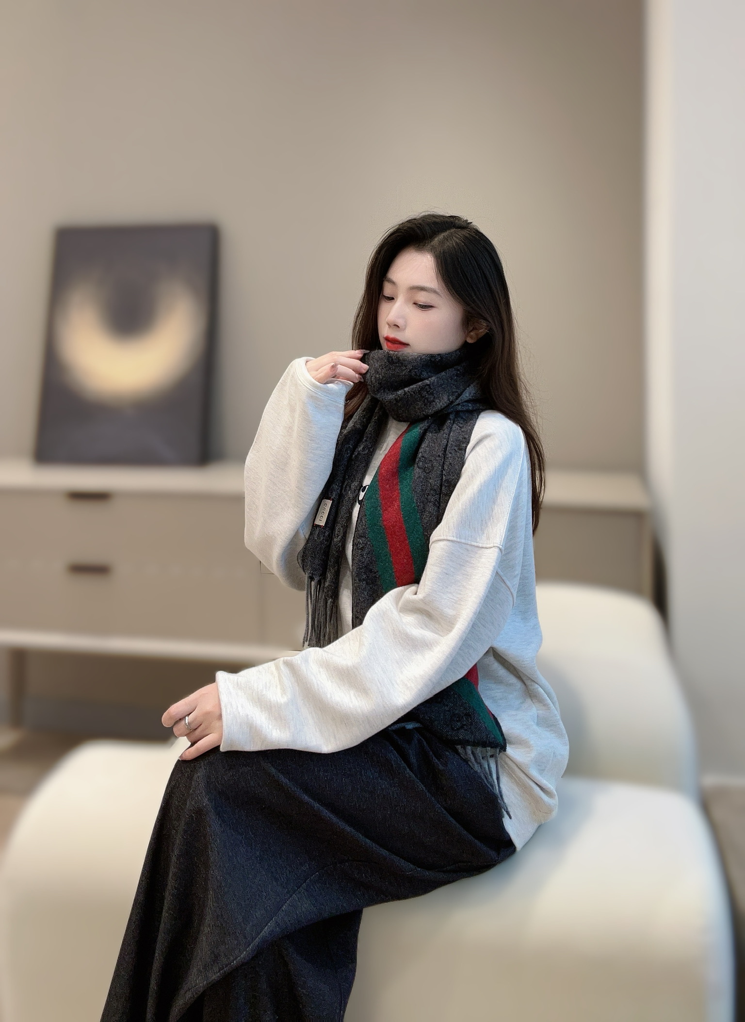 這條圍巾真的超級經典又百搭!採用標誌性的雙G提花設計,整體低調卻不失辨識度,那種一眼就能看出的高級質感,讓人完全無法忽視。