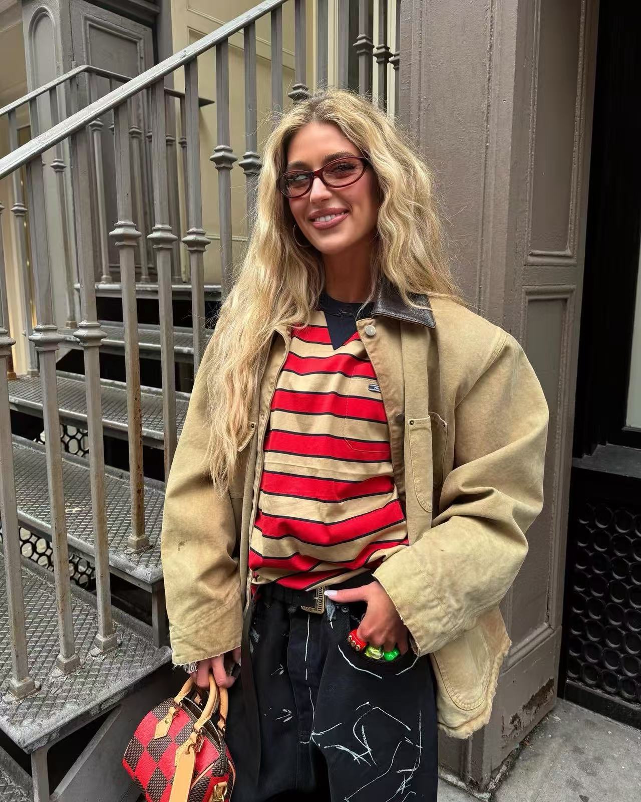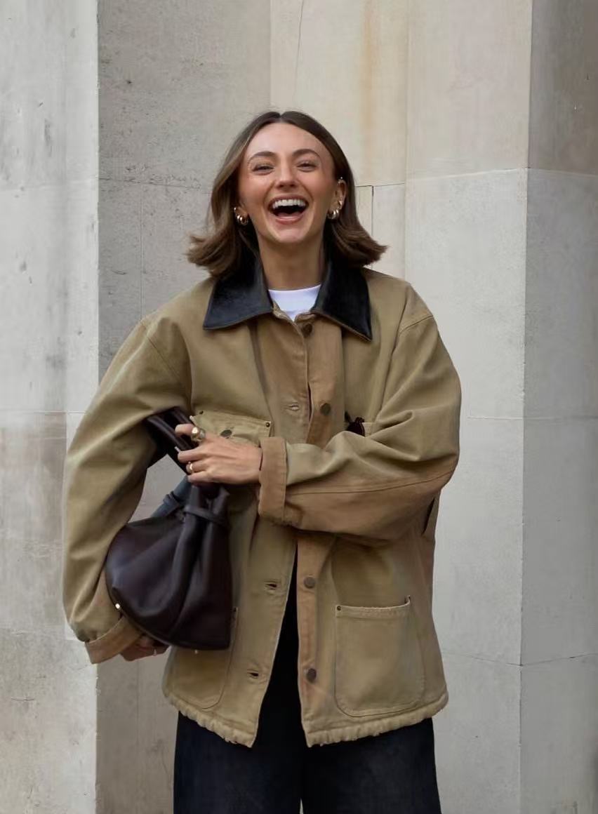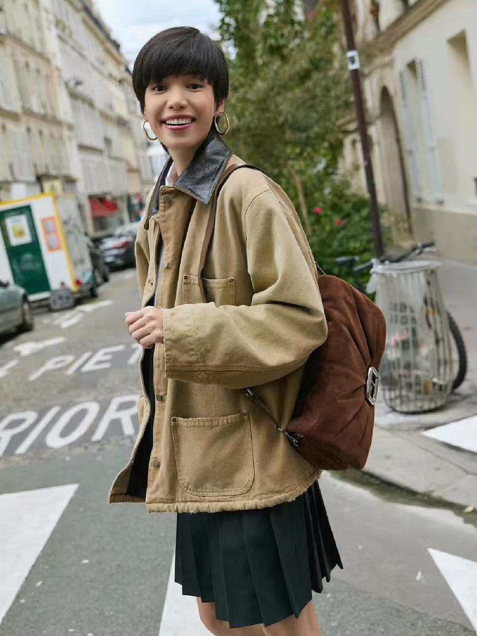 雙排扣設計簡約大氣,翻蓋口袋的細節處理,為整體造型增添一絲法式俐落與時髦。