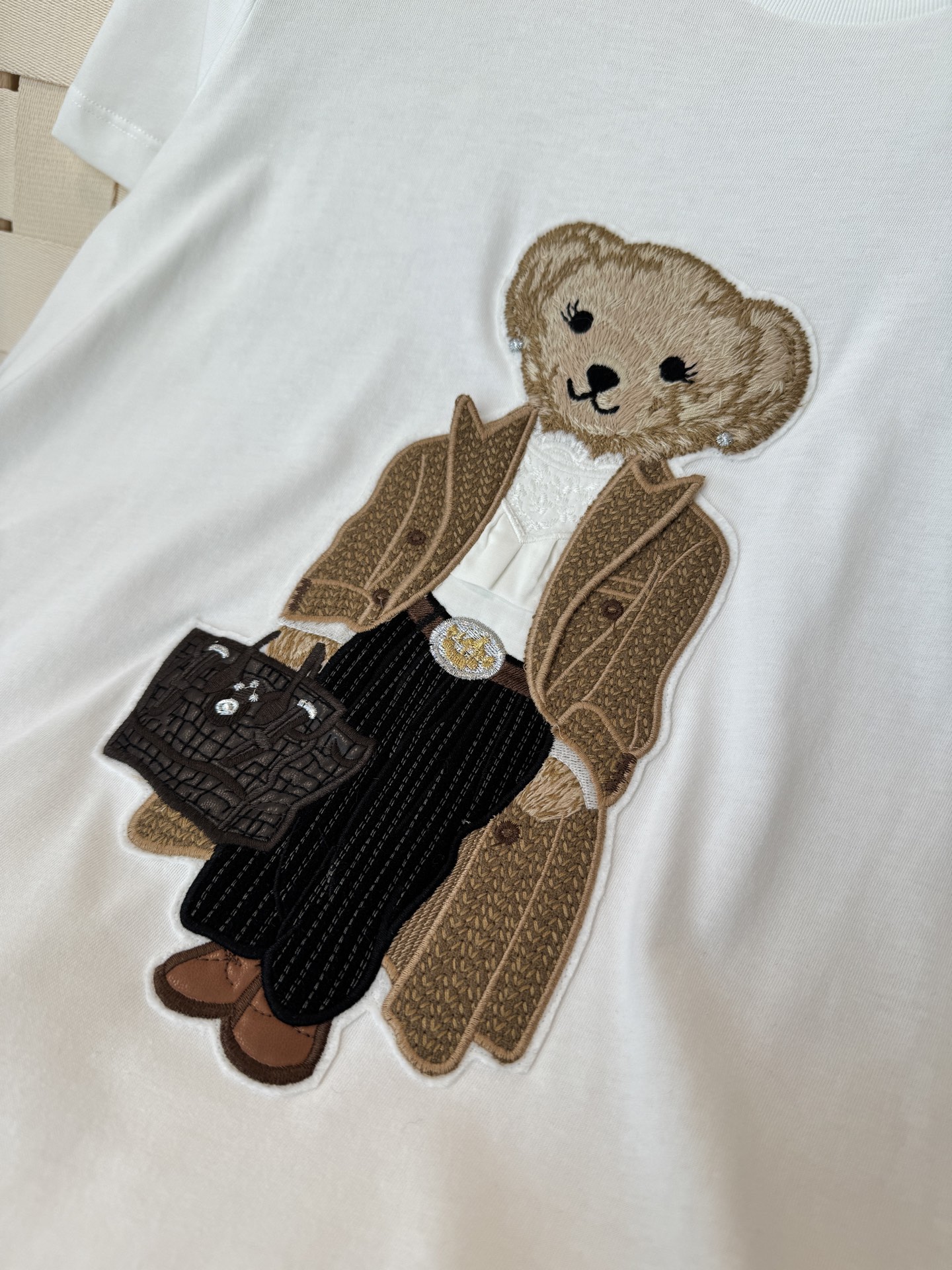 胸前的「風衣小熊」刺繡章仔細節滿滿,立體精緻、層次分明,完全是品牌工藝的精華呈現。這件T恤在奢侈品潮流中獨樹一幟,讓人越看越喜歡。