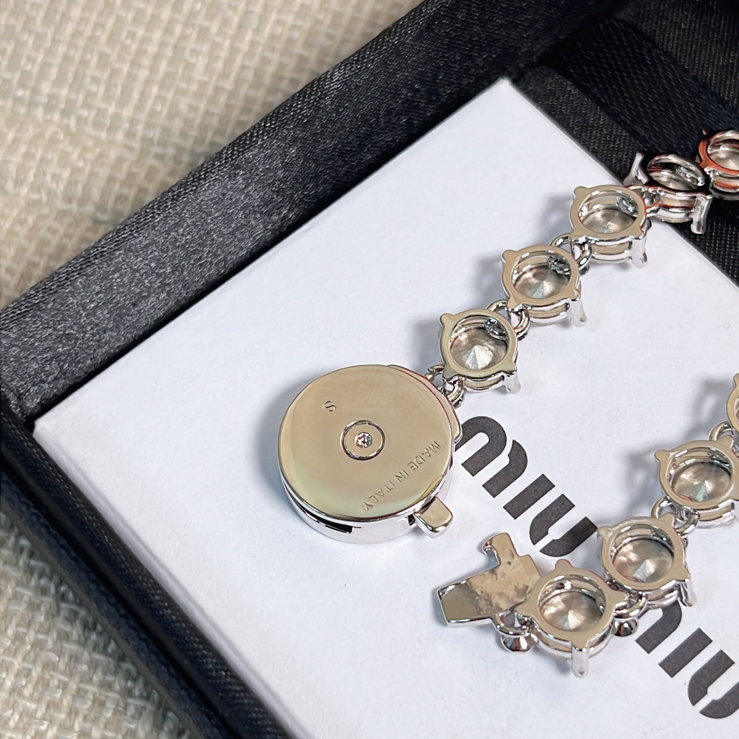 圓牌上點綴著琺瑯字母 Logo,再搭配一顆超大施華洛水晶鑽,光澤感與存在感都超強烈。