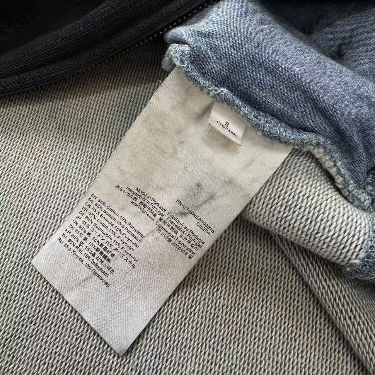布料從紗線開始就下重本:280g 定織定染精梳棉,先無塵燒毛去雜毛,再輕度蝕毛讓表面起絨,摸起來軟厚不粗糙。印花部分先用進口膠漿手工定位,再疊加數碼直噴,層次分明不掉色。成衣完成後整件馬騮噴色做舊,色澤深淺自然過渡,最後人工定點磨破——袖、袖口、口袋邊多處破壞點,位置、深淺都照正品 1:1 還原,壞得剛剛好,不會過火。