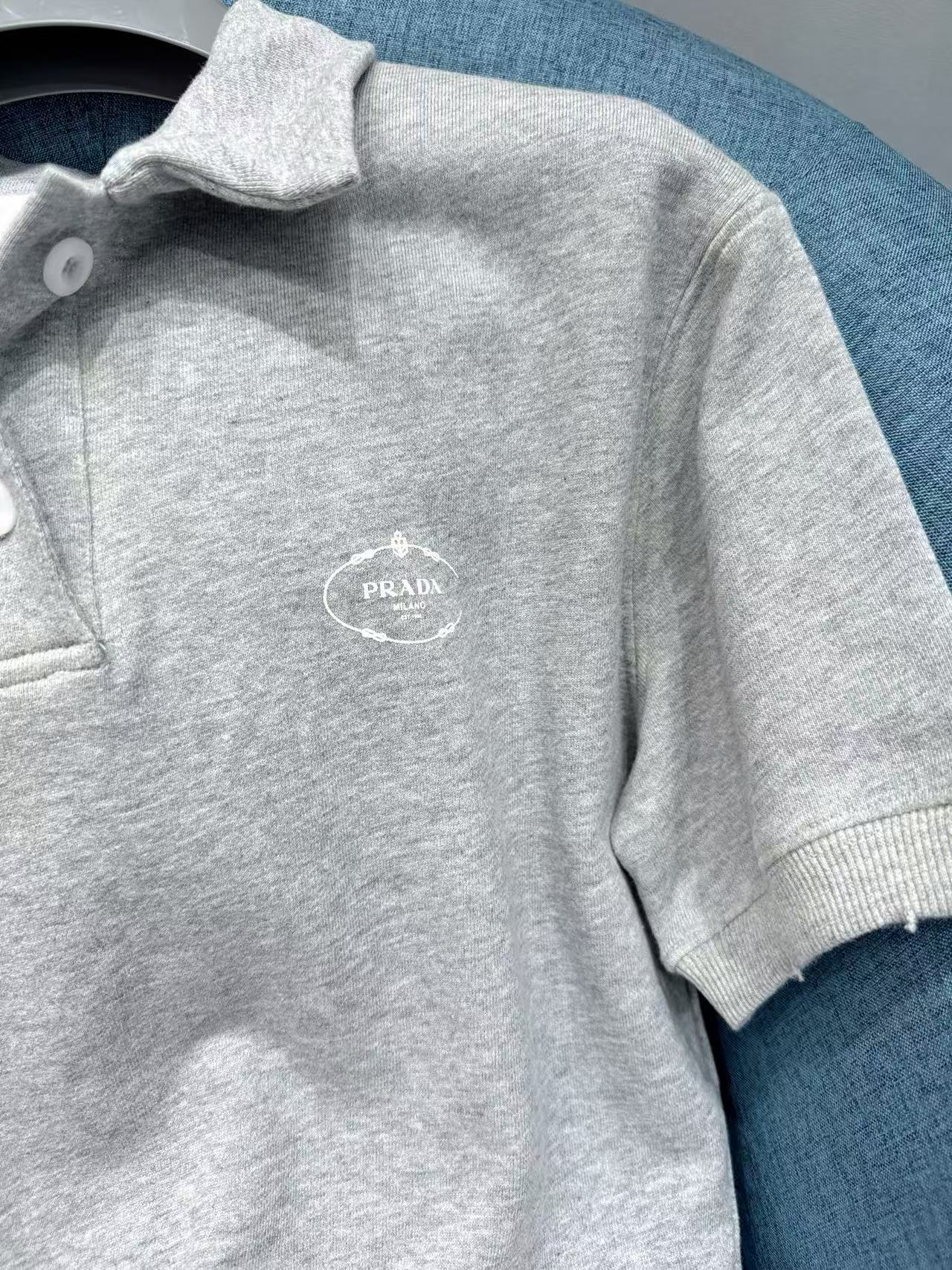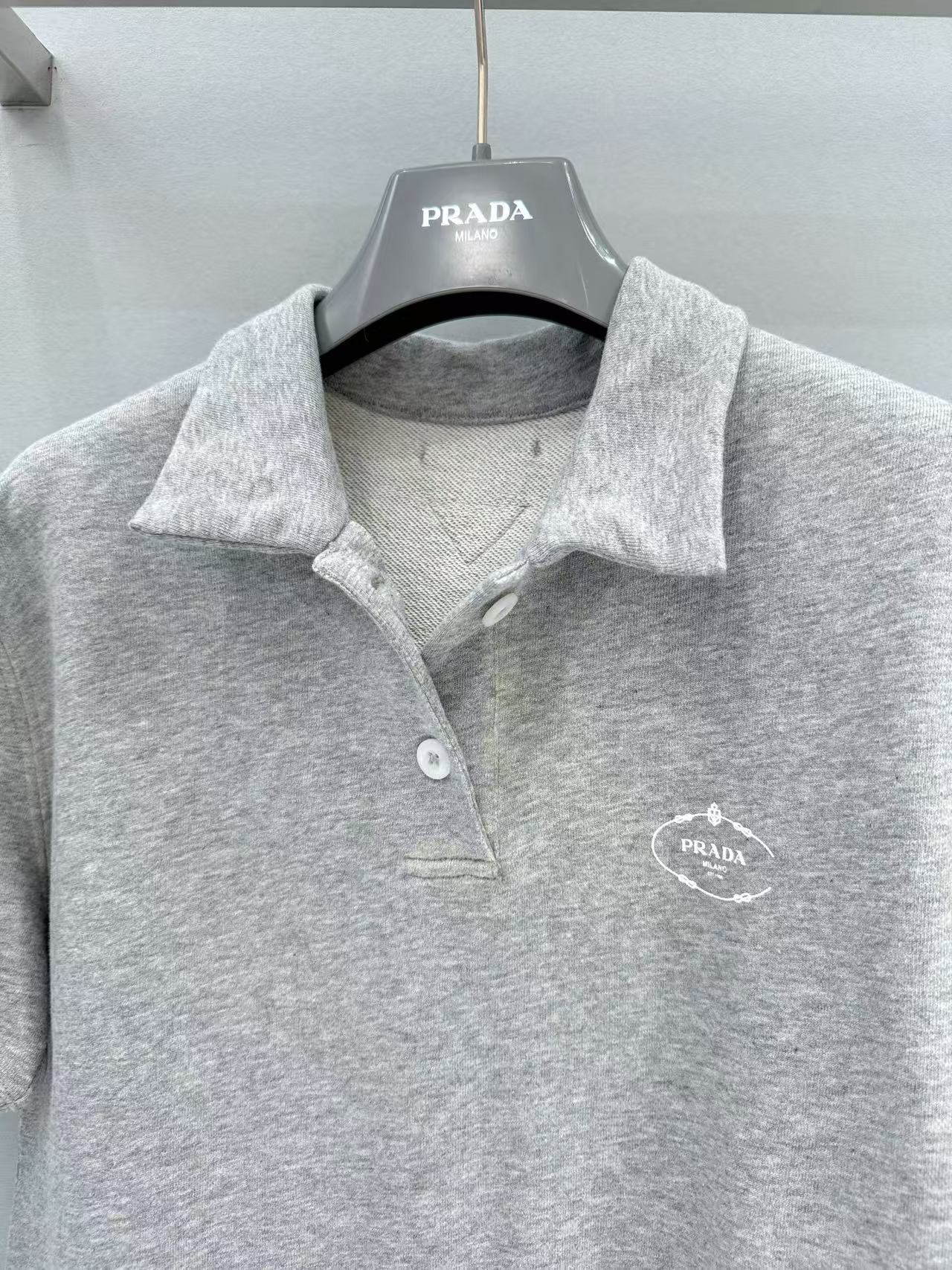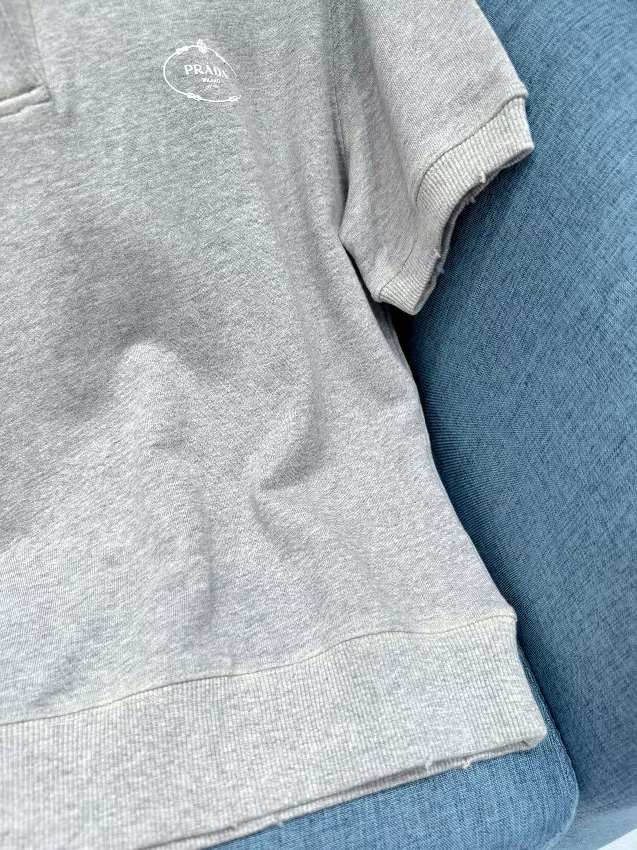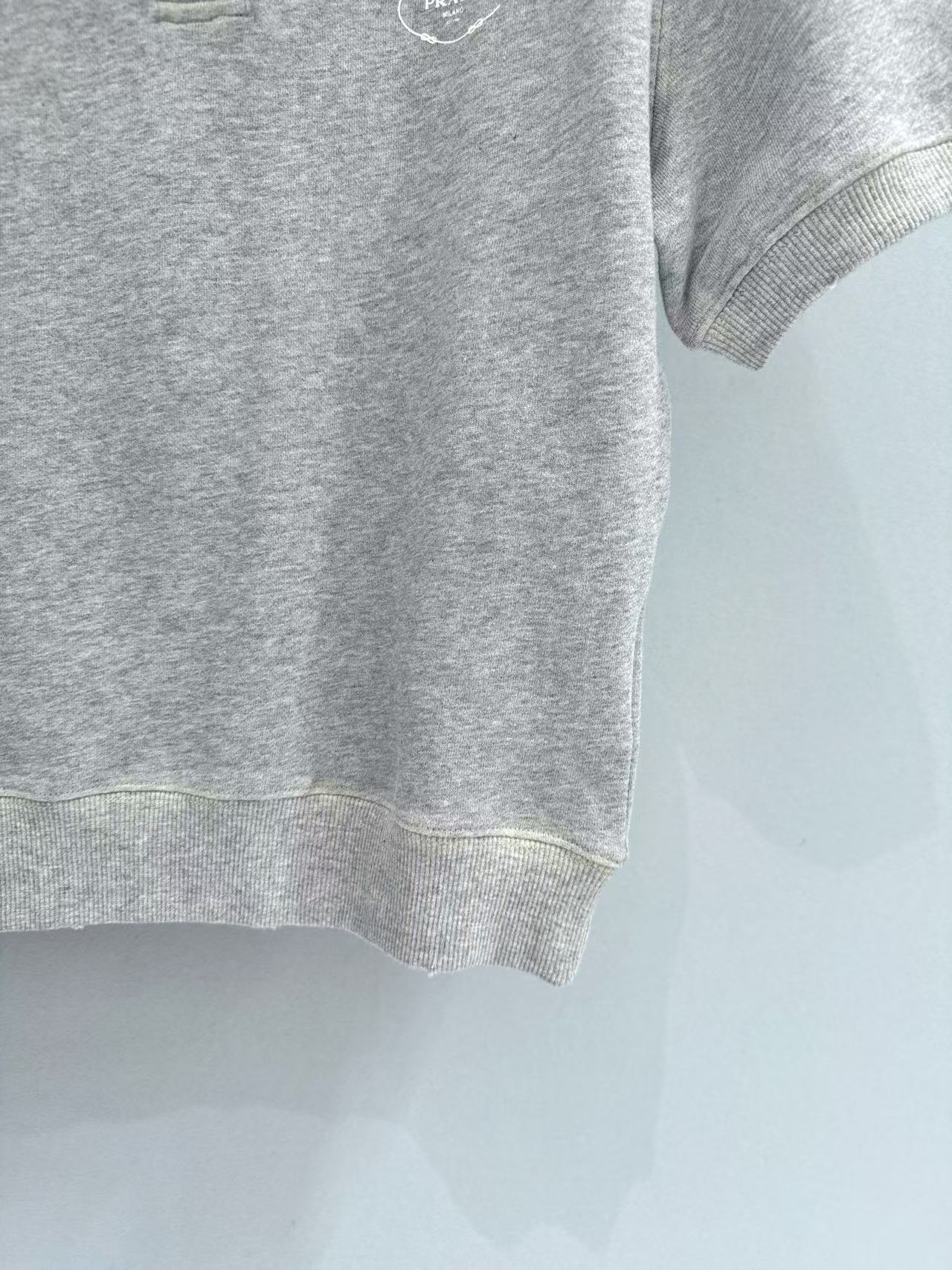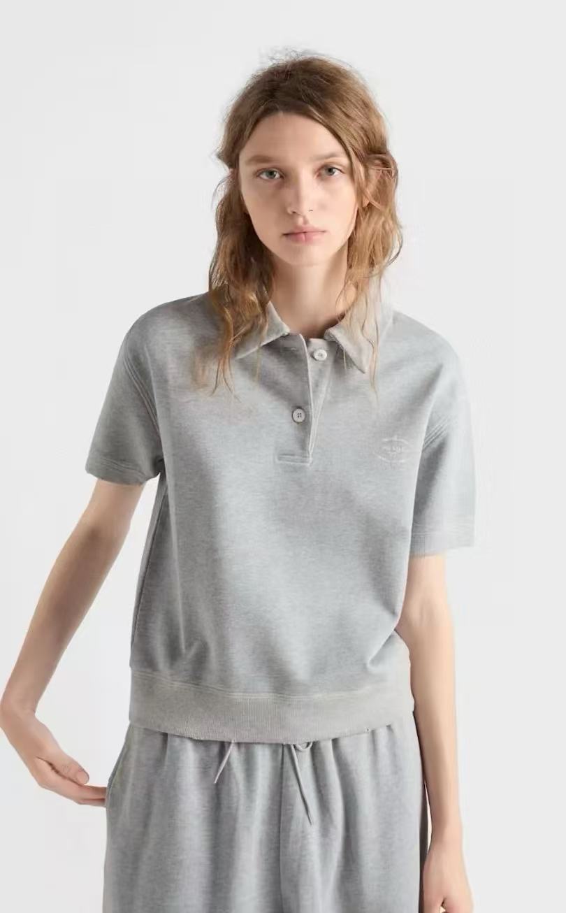2025早秋 Prada 灰色polo短袖 精品復刻,整體以做舊字母印花設計,帶出復古運動感。