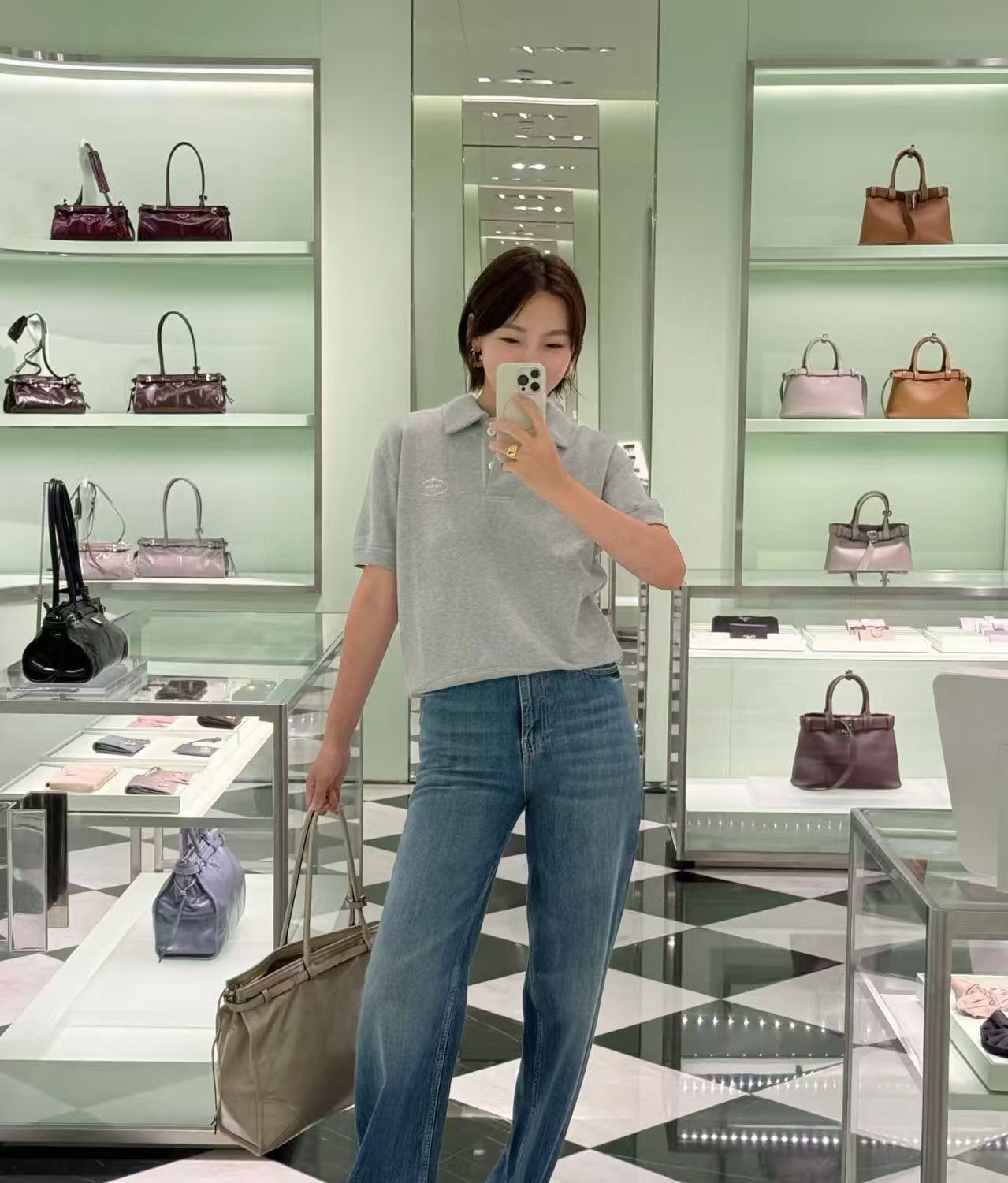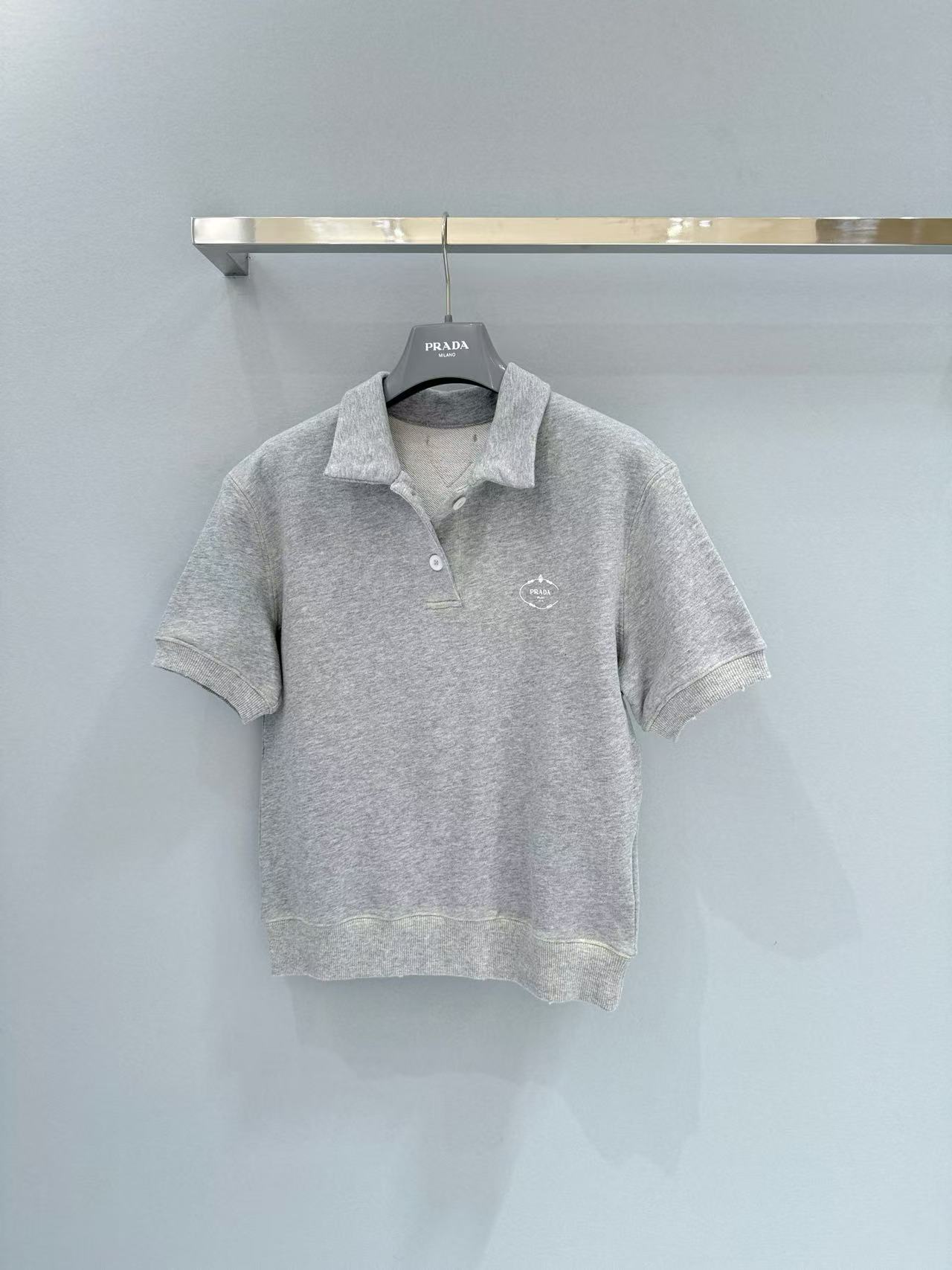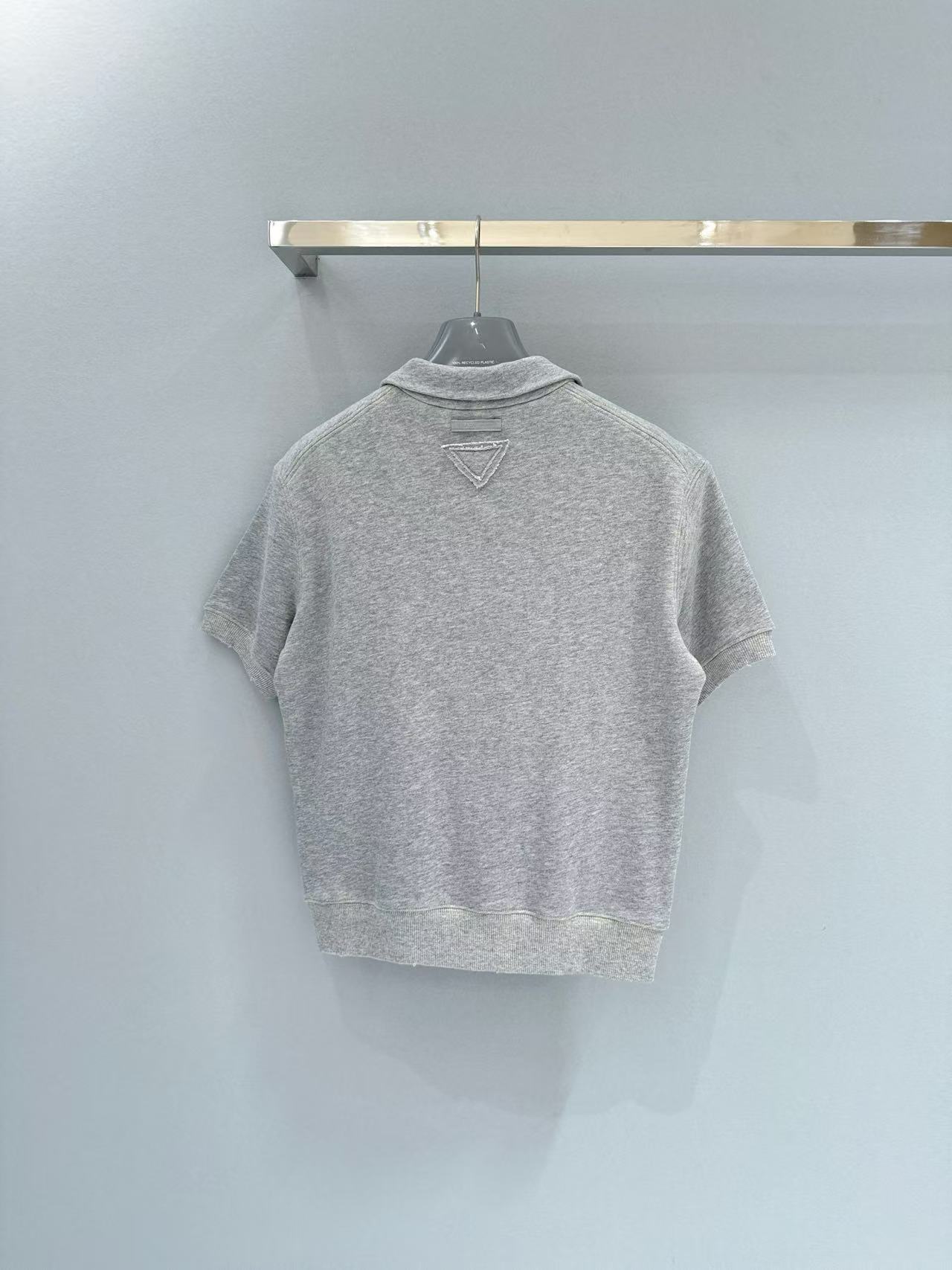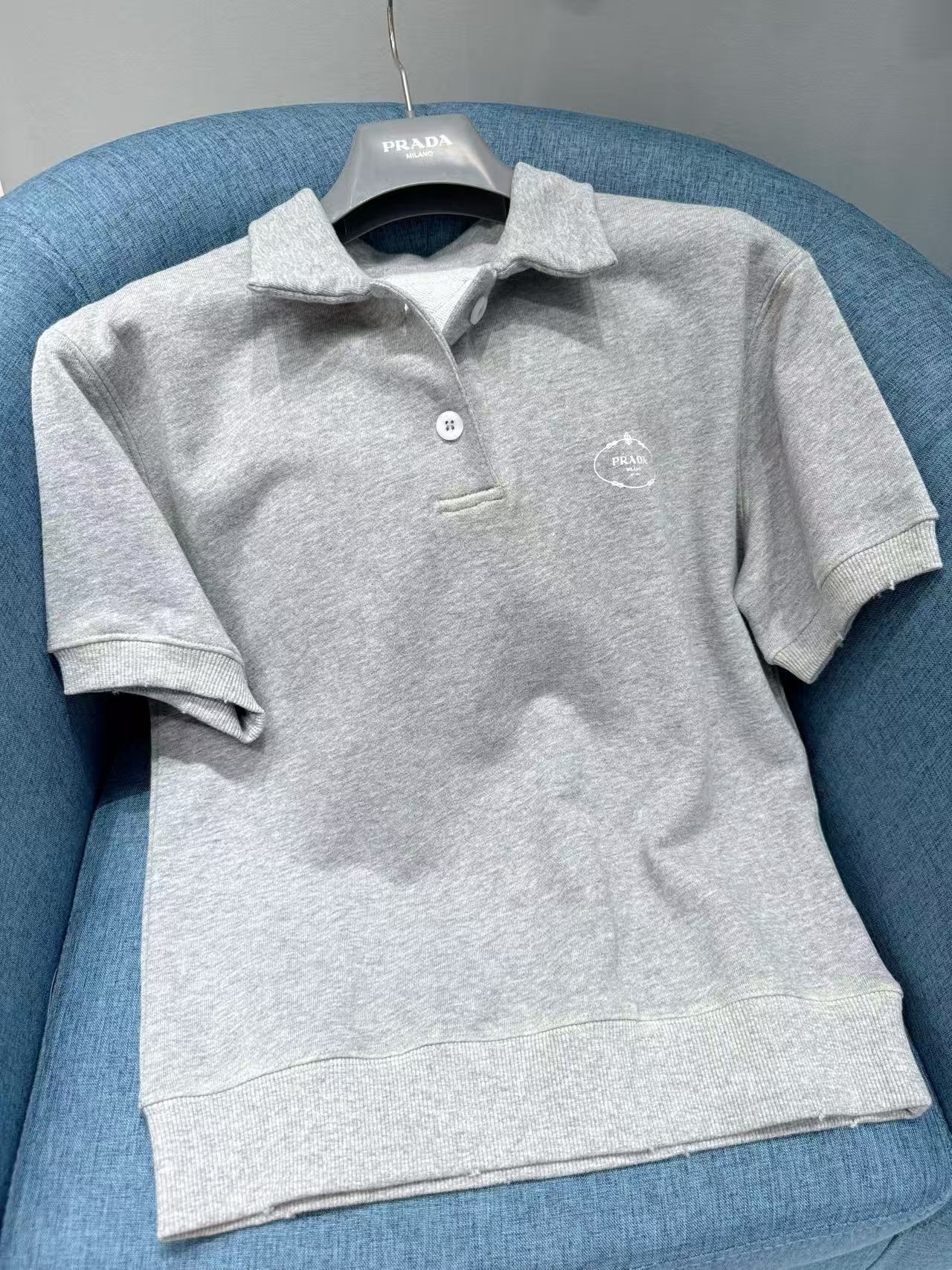 2025早秋 Prada 灰色polo短袖 精品復刻,整體以做舊字母印花設計,帶出復古運動感。