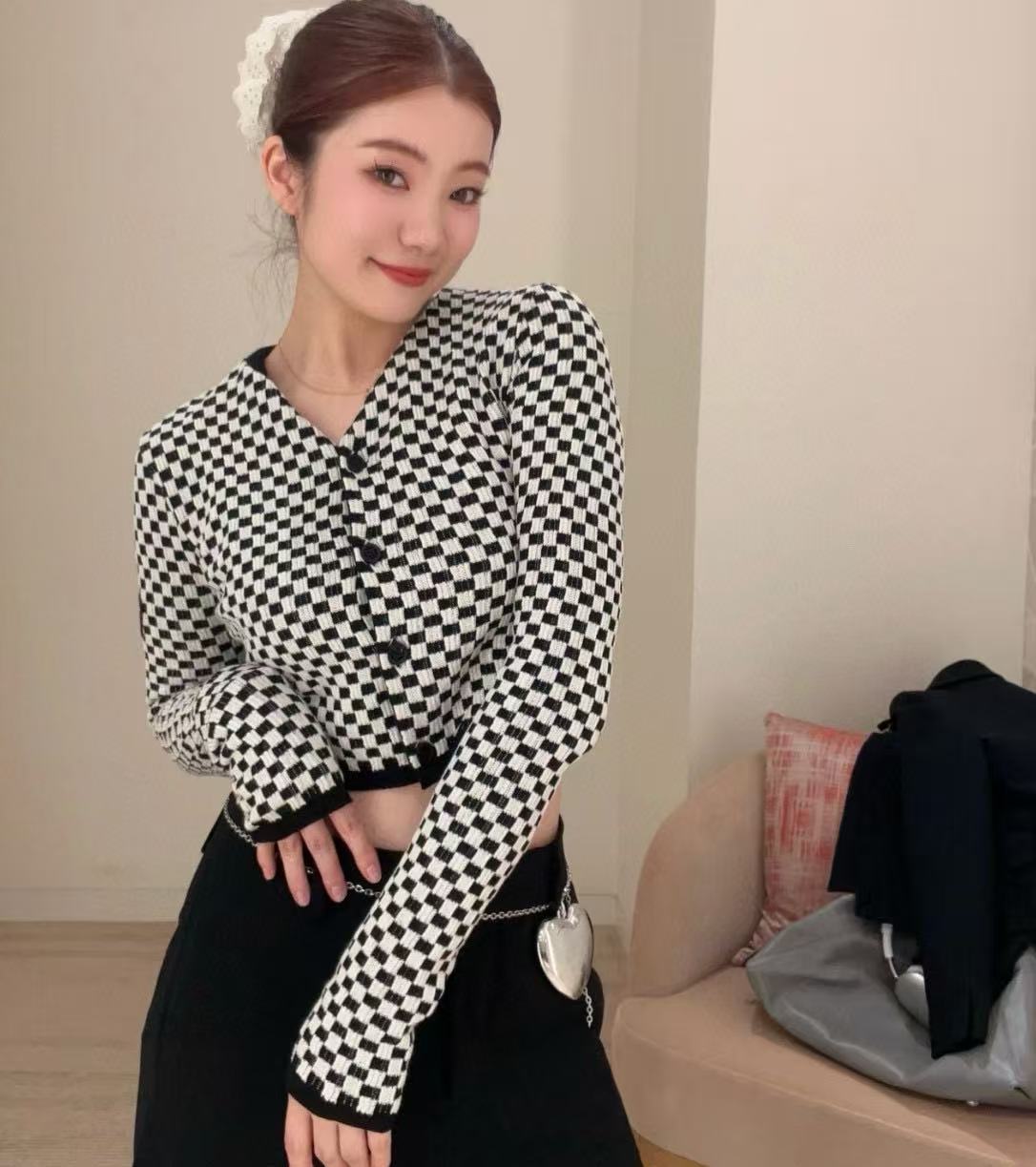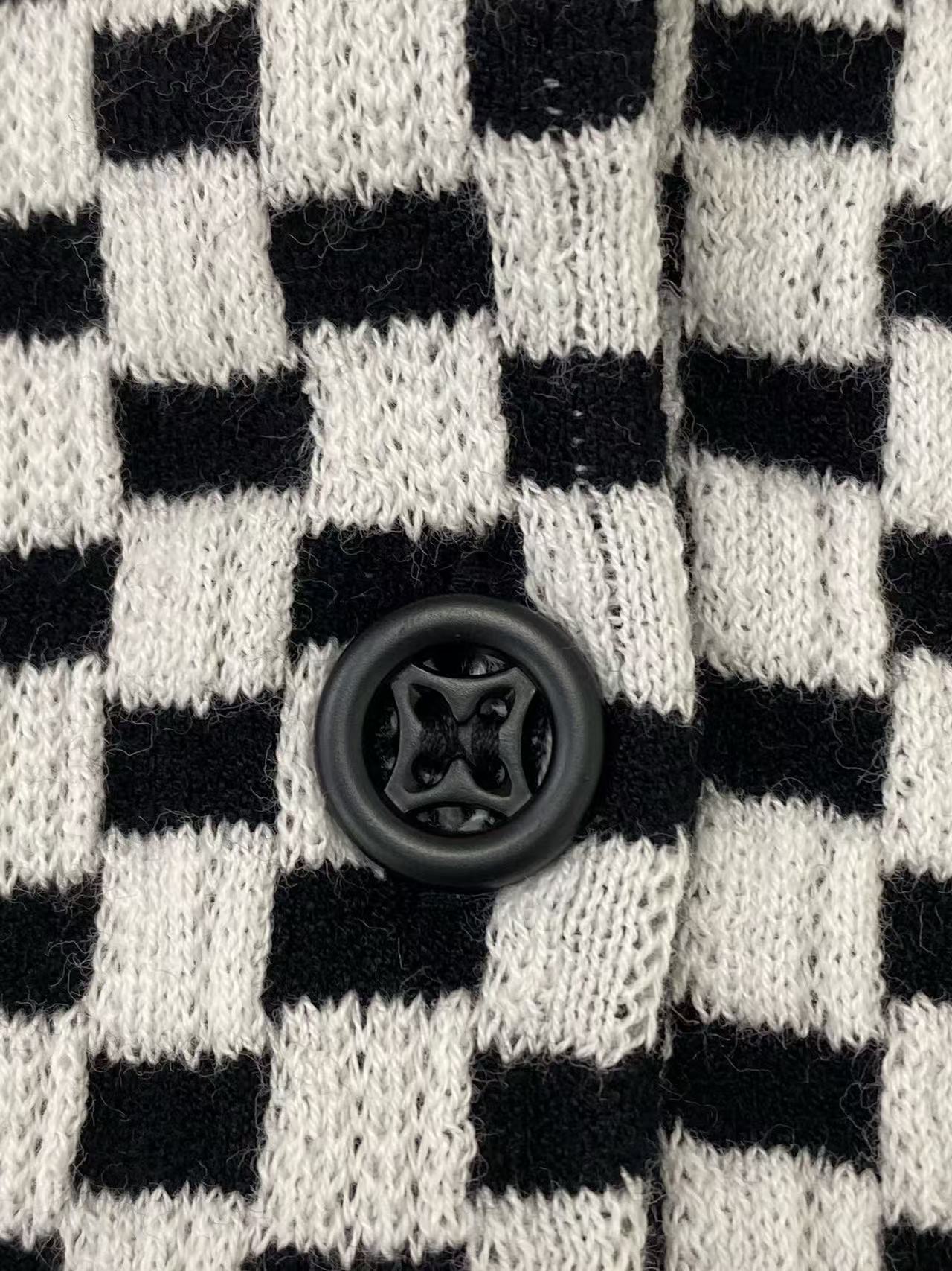這款開衫以黑白Damier棋盤格為靈魂,圖案經典吸睛,視覺立體凹凸,充滿都市Lady的精緻氣息。V領剪裁修飾頸部線條,版型修身有型,適合各種身形。暗門襟設計採用反面貼底工藝,低調精緻,搭配訂製真皮袖標,細節處散發A貨的高級質感。無論單穿展現主角光環,還是內搭襯衫或層搭大衣,都能為你的造型增添一抹時髦層次,從職場到約會,都能輕鬆駕馭!