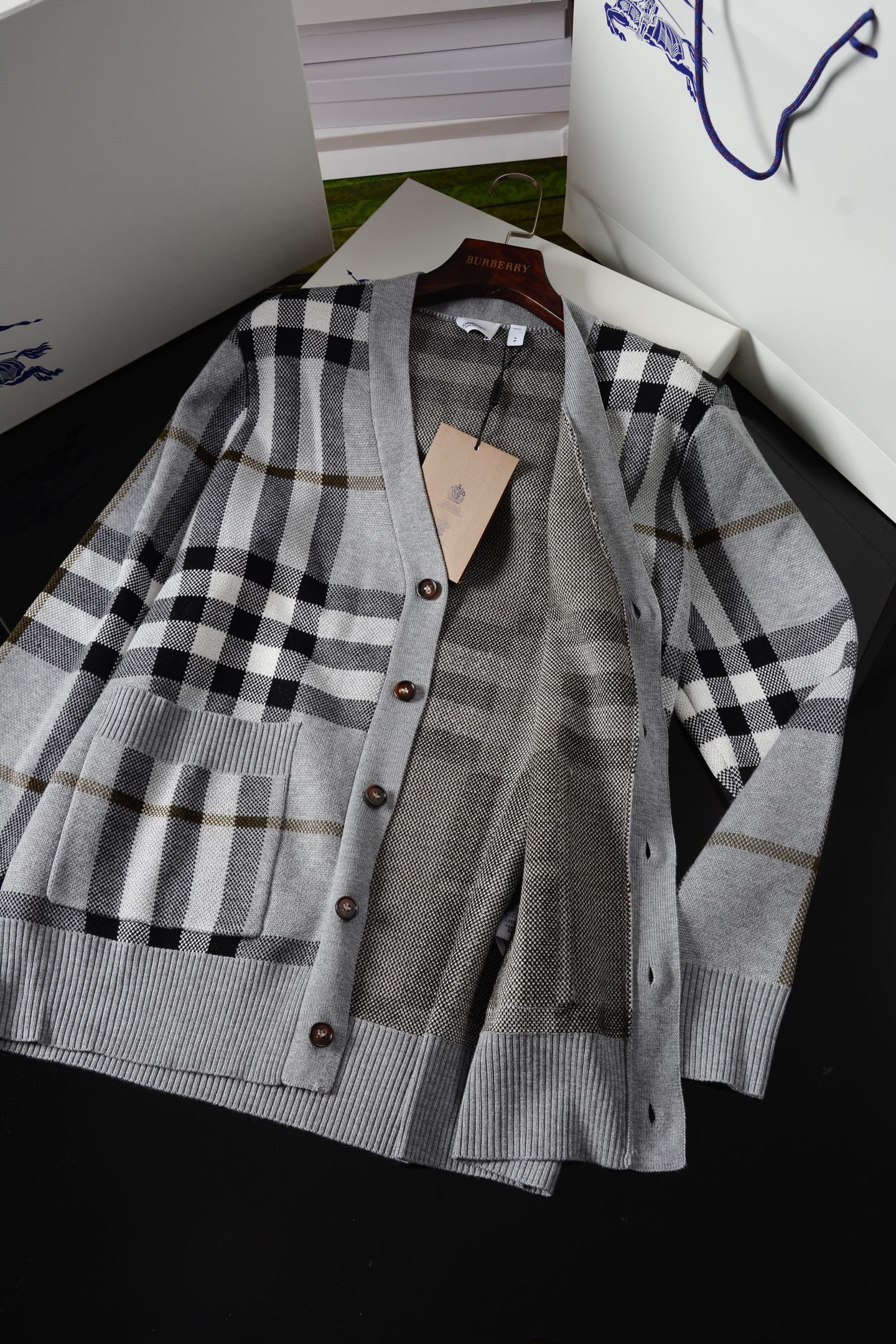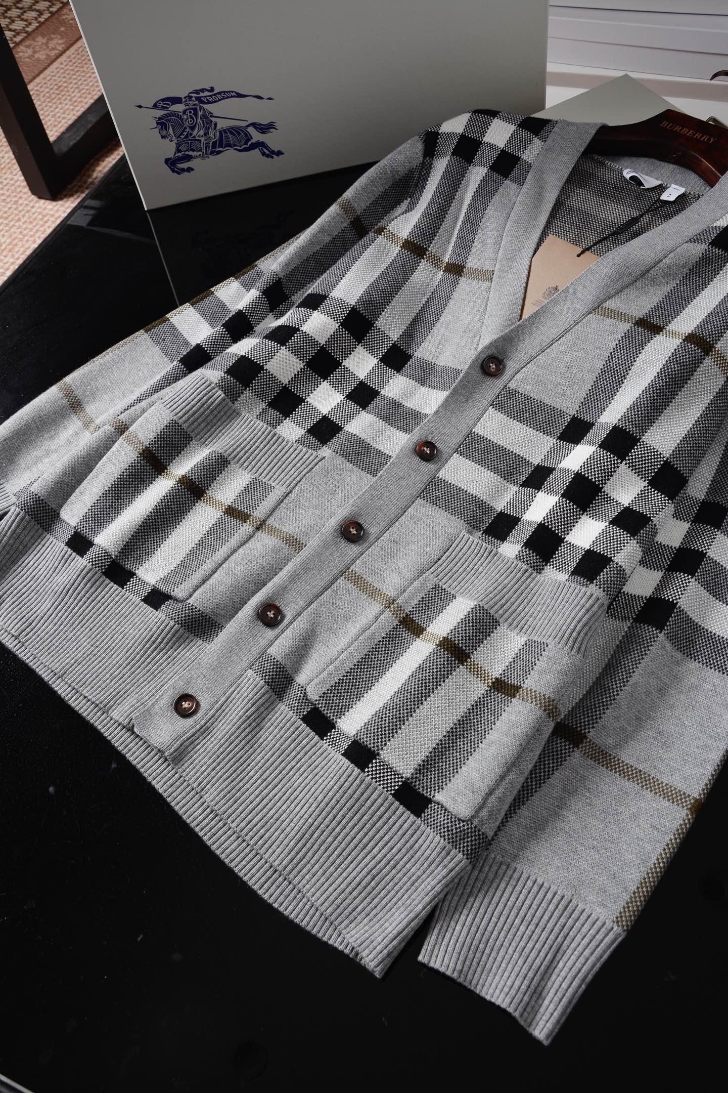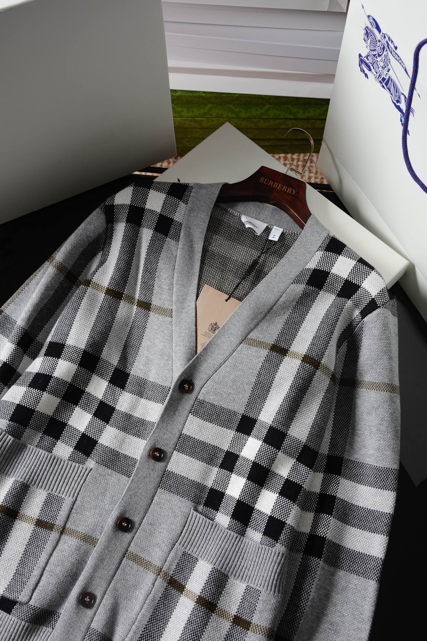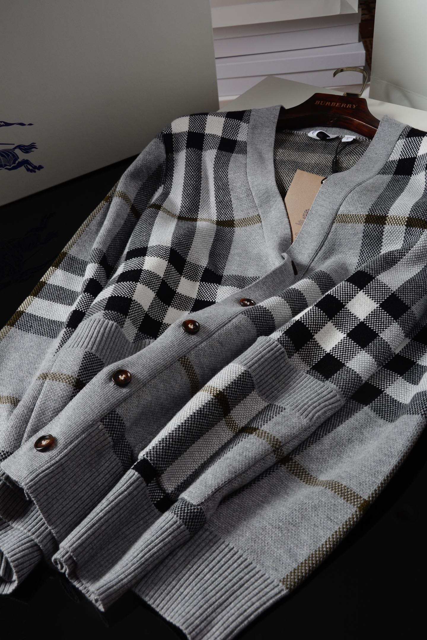 2025秋冬新品 Burberry 灰色格紋羊毛混紡提花開衫 精品 高仿