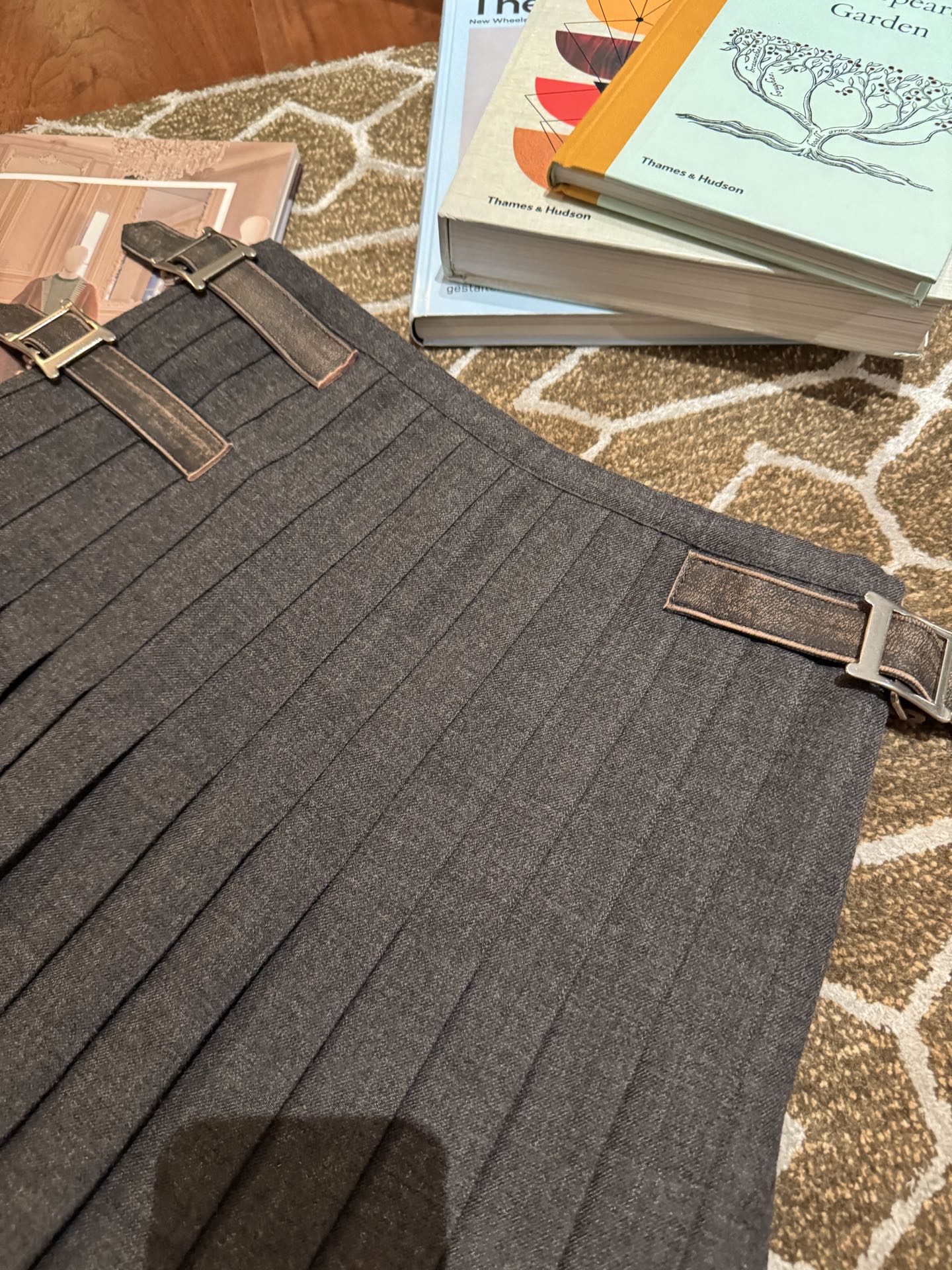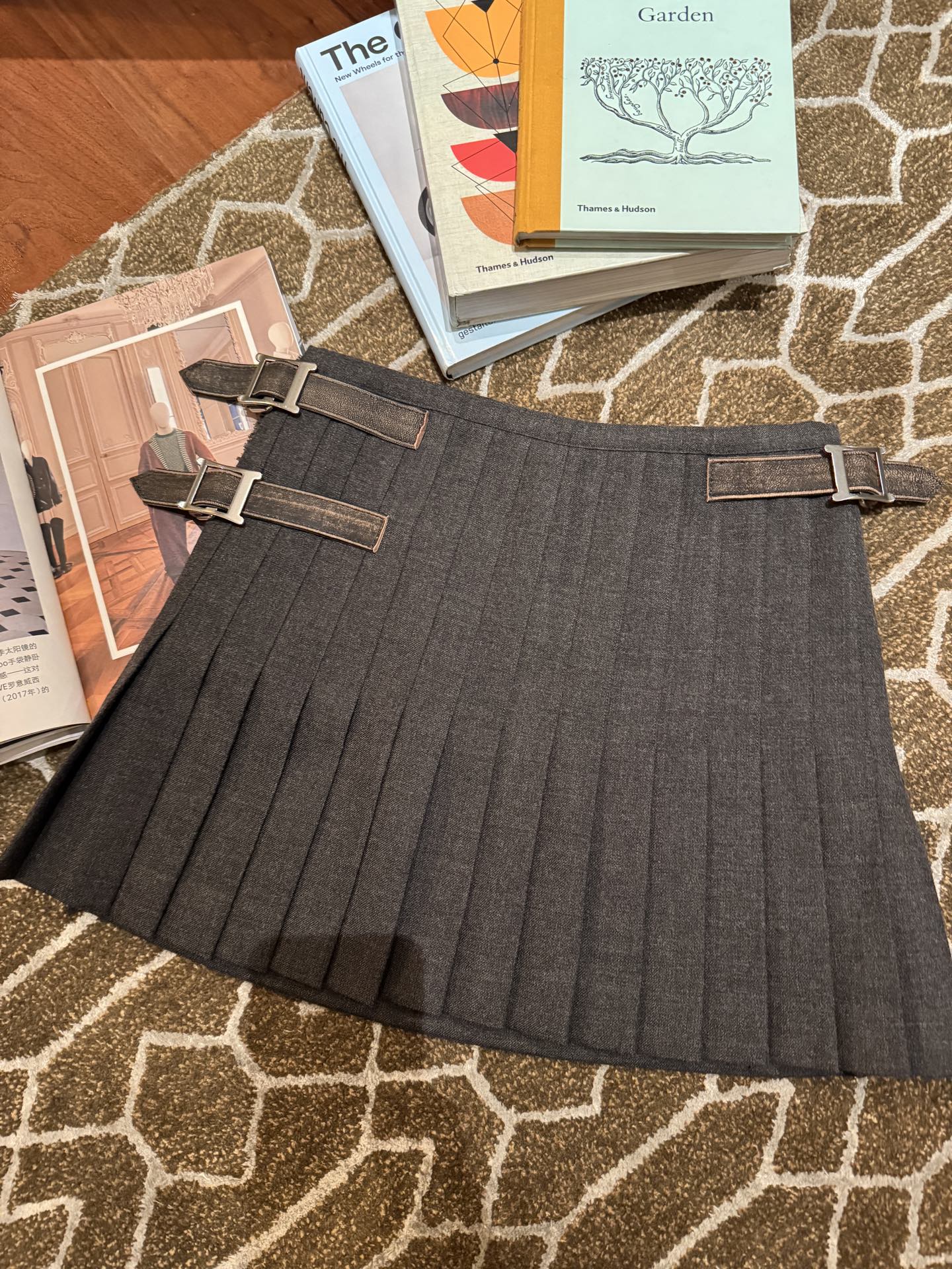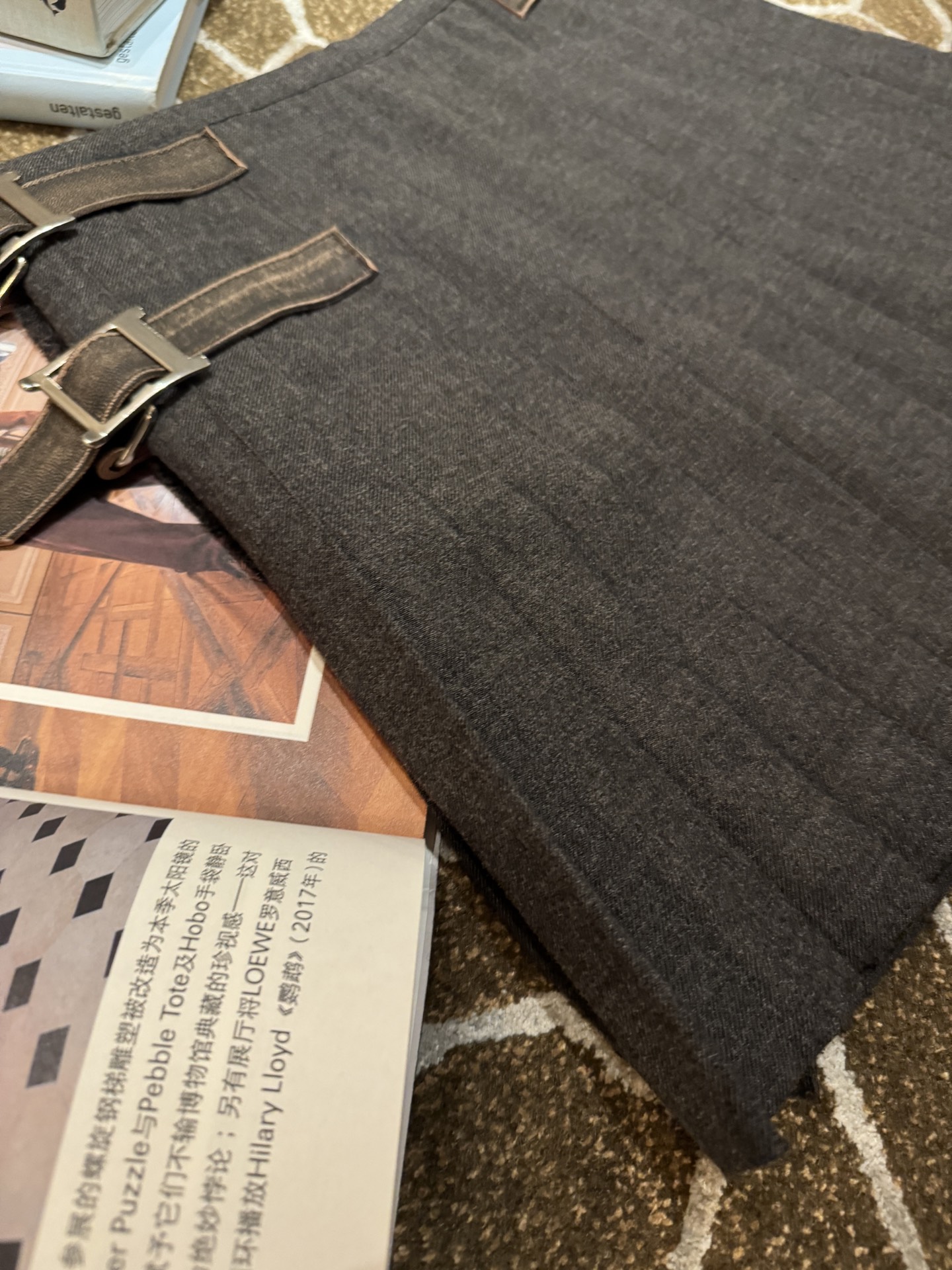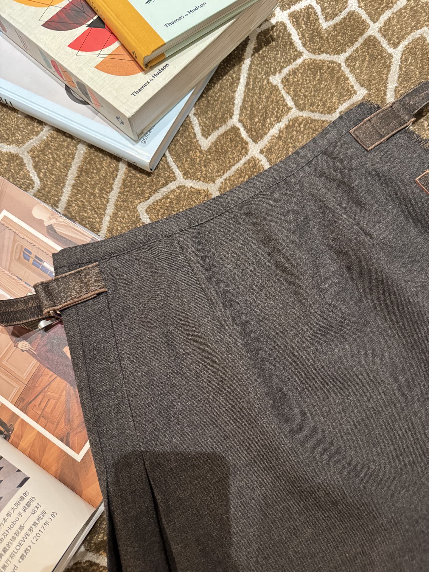 主體選用高級羊毛材質,質地柔軟不刺膚,觸感細緻有挺度,能自然撐起百摺線條;裙腰處的皮扣細節則採用小羊皮材質,光澤細膩且質感滿分。