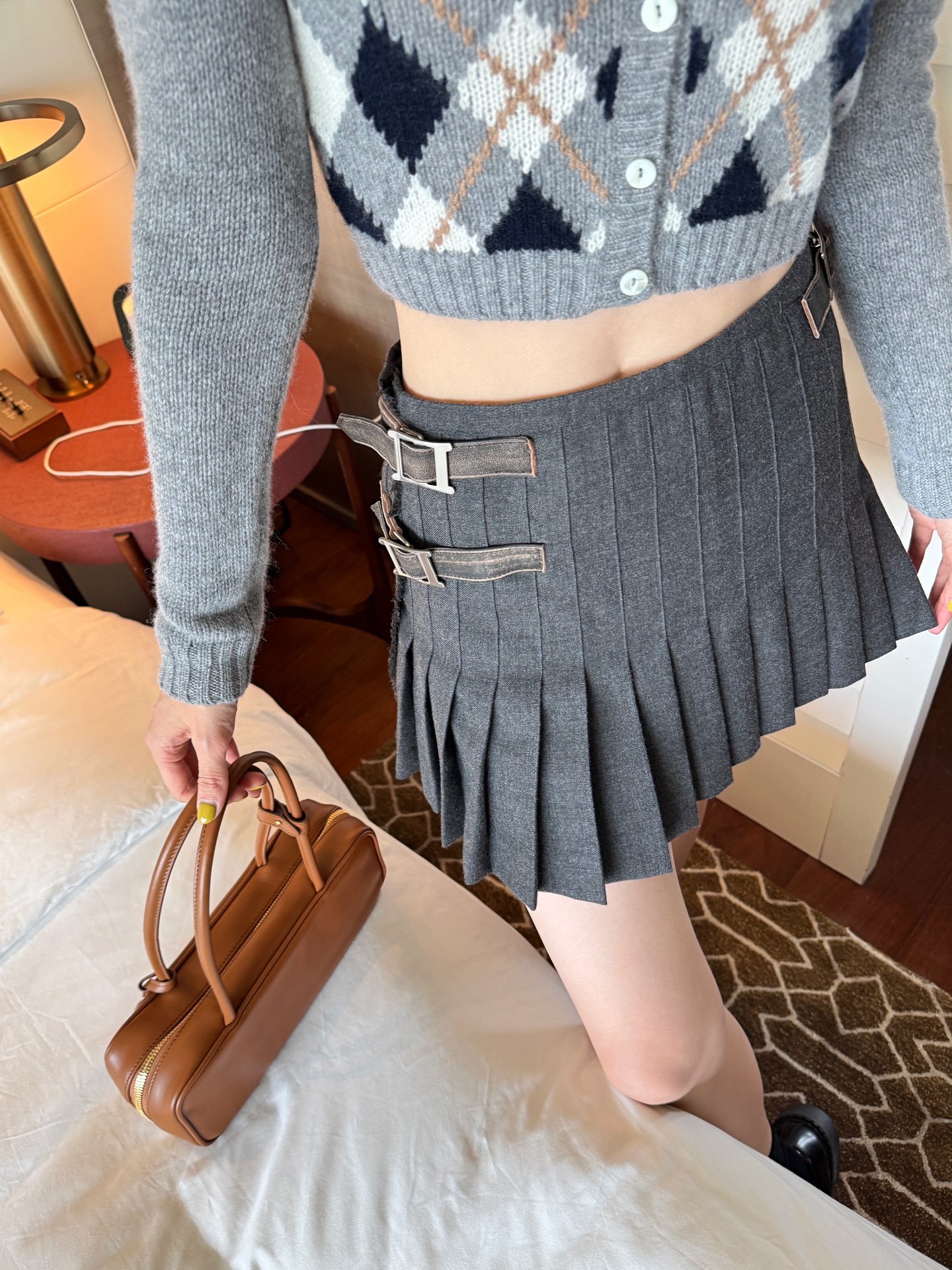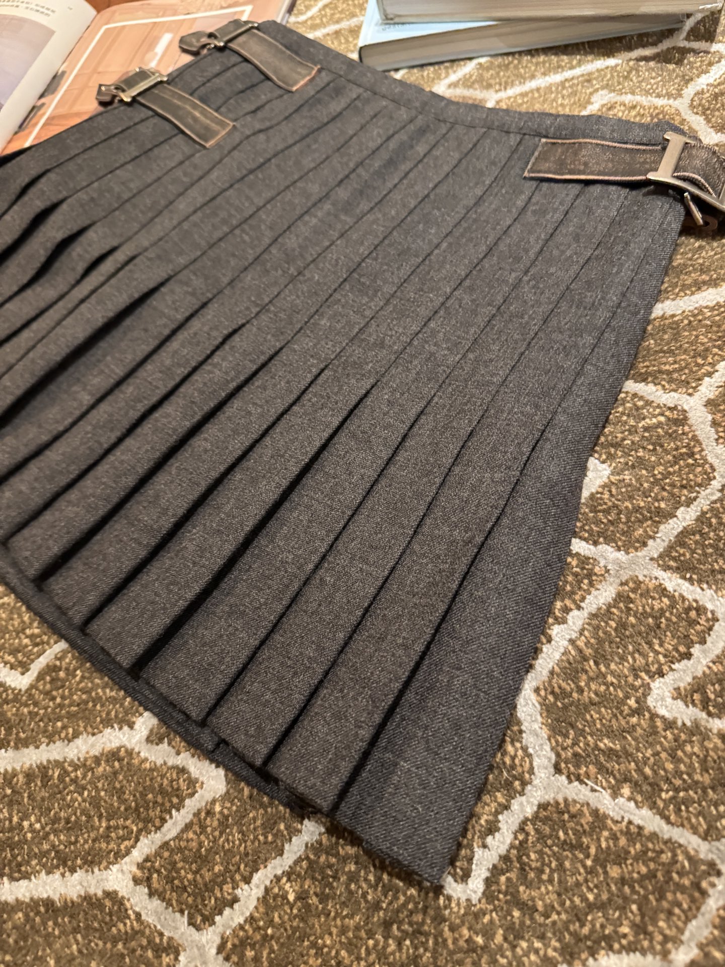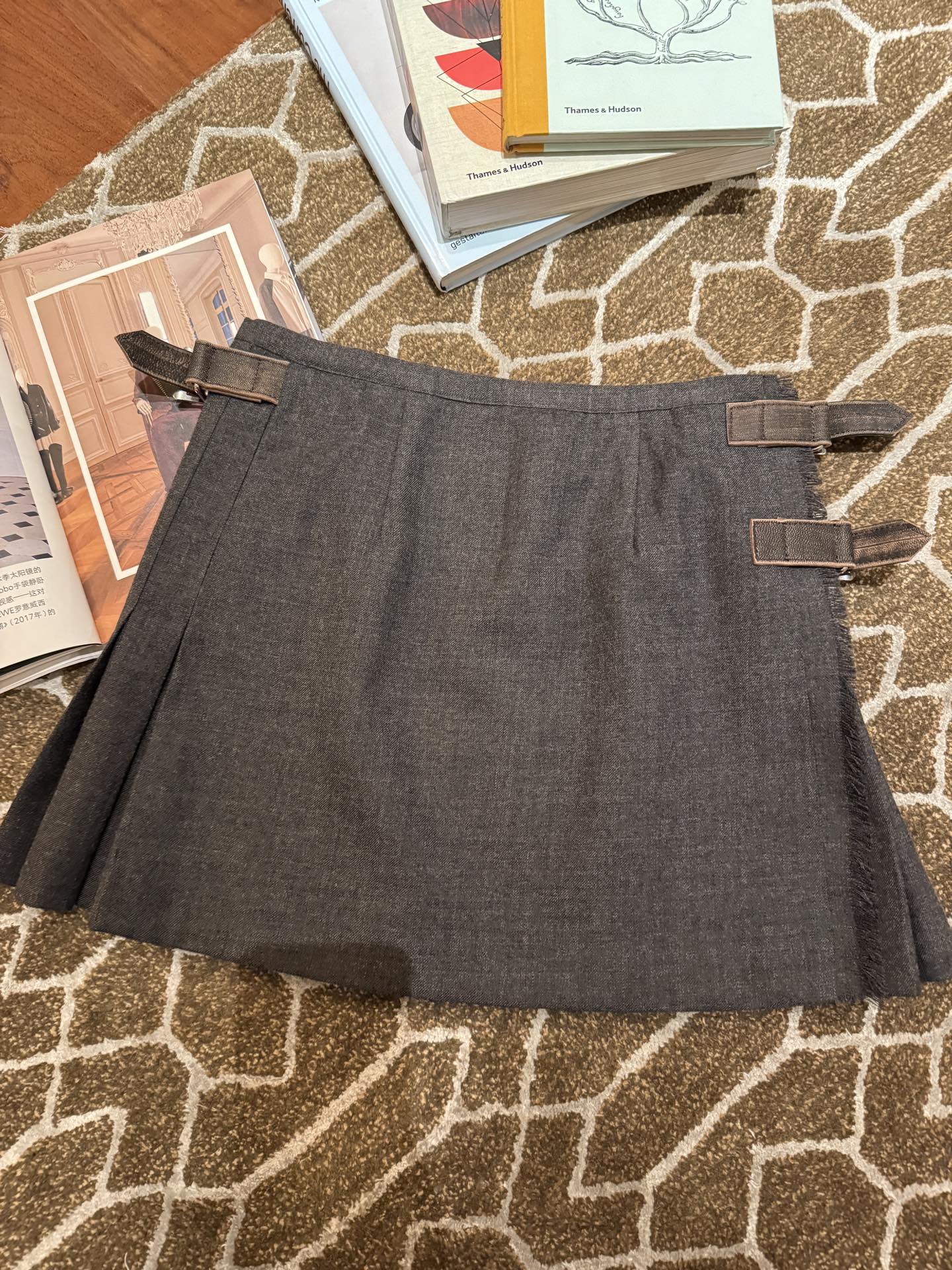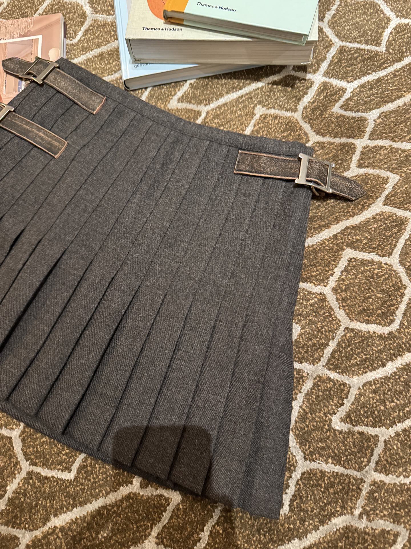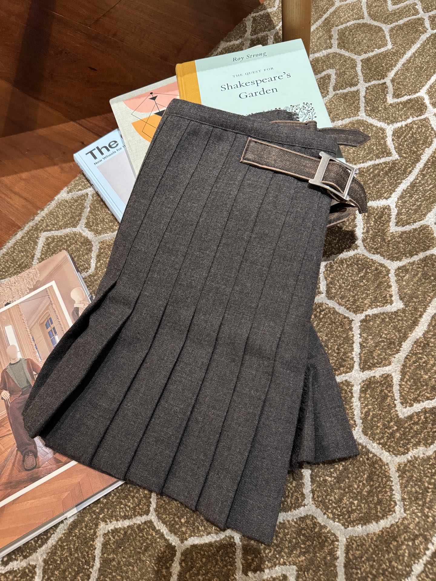 主體選用高級羊毛材質,質地柔軟不刺膚,觸感細緻有挺度,能自然撐起百摺線條;裙腰處的皮扣細節則採用小羊皮材質,光澤細膩且質感滿分。