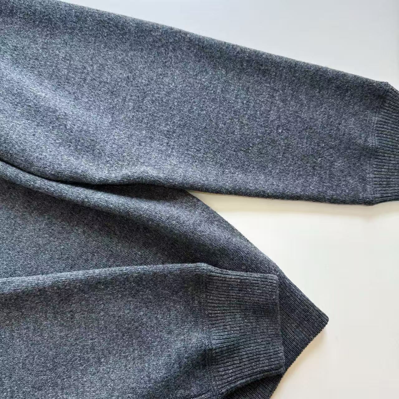 這件毛衣的材質真的非常講究!它使用了羊毛混紡的花灰布料,透過 14 針的高支細針距編織,讓毛衣輕薄柔軟且垂墜感極佳,穿在身上親膚又舒服,完全是那種雲朵般的舒適感。
