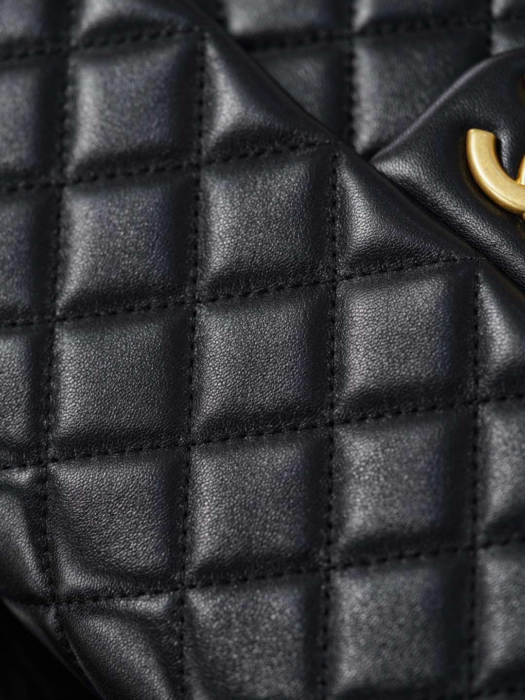 選用頂級法國純 A 級小羊皮,觸感柔軟細緻,帶有自然油光,整體輕盈卻富有彈性。皮質表面滑順如棉花糖般細膩,摸起來有一種微微回彈的柔軟感。內襯為奢華金色全皮設計,金屬光澤與外層黑皮相互呼應,展現低調卻極致的高貴氣息。