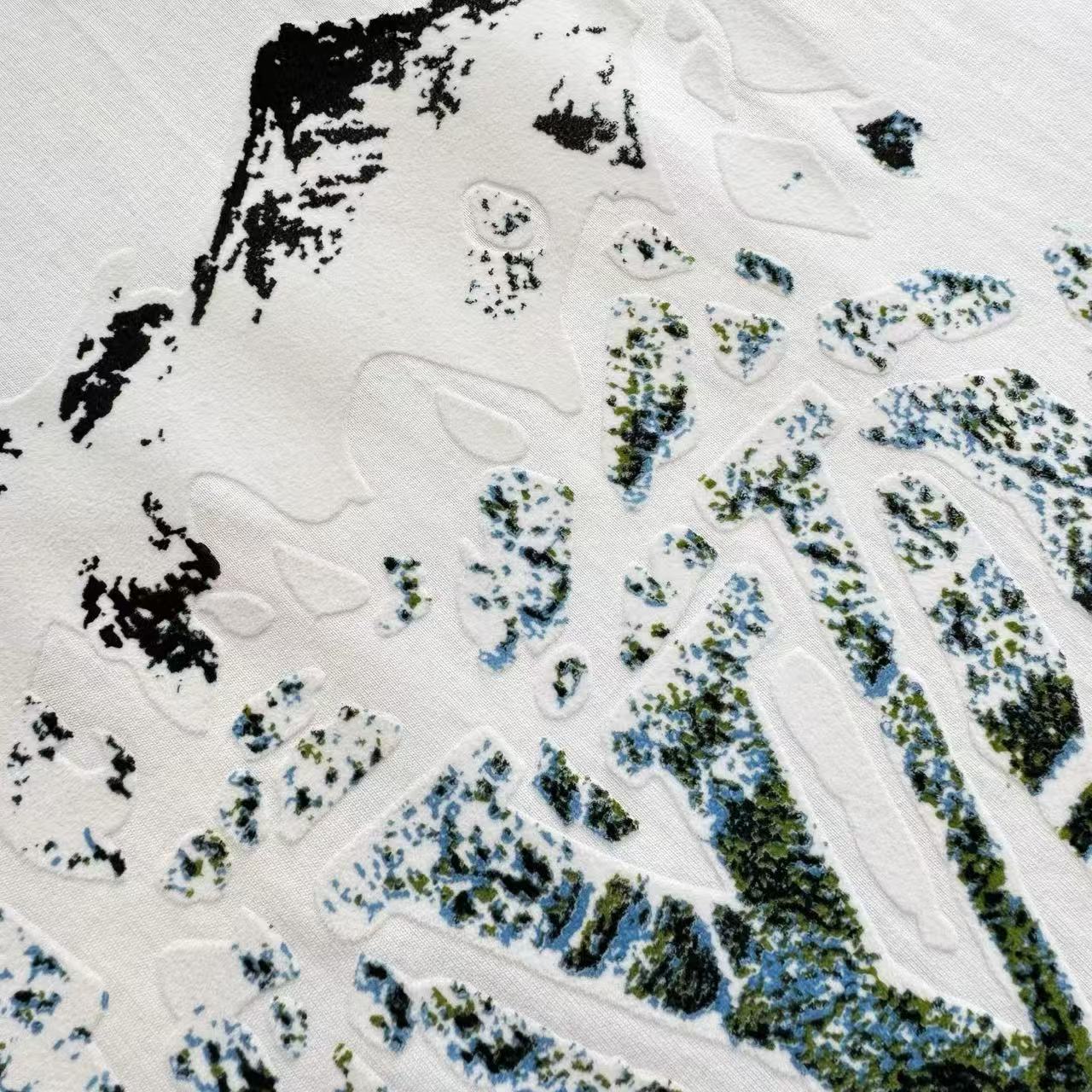 這款圓領短袖以經典圓領剪裁與直筒版型為基調,線條俐落、結構感強,輕鬆修飾身形比例。多色絲絨印花是最大亮點,岩峰雪地森林景致透過高精度網版多次套色,絨面短促密集、立體飽滿;不同顏色區域光線反射各異,完美模擬自然質感差異。裂縫效果留白設計增添層次,視覺如真實雪徑。無論單穿還是內搭外套,這件短袖都能為你的造型注入滿滿的滑雪系列藝術風情,仿若奢侈品般的質感!